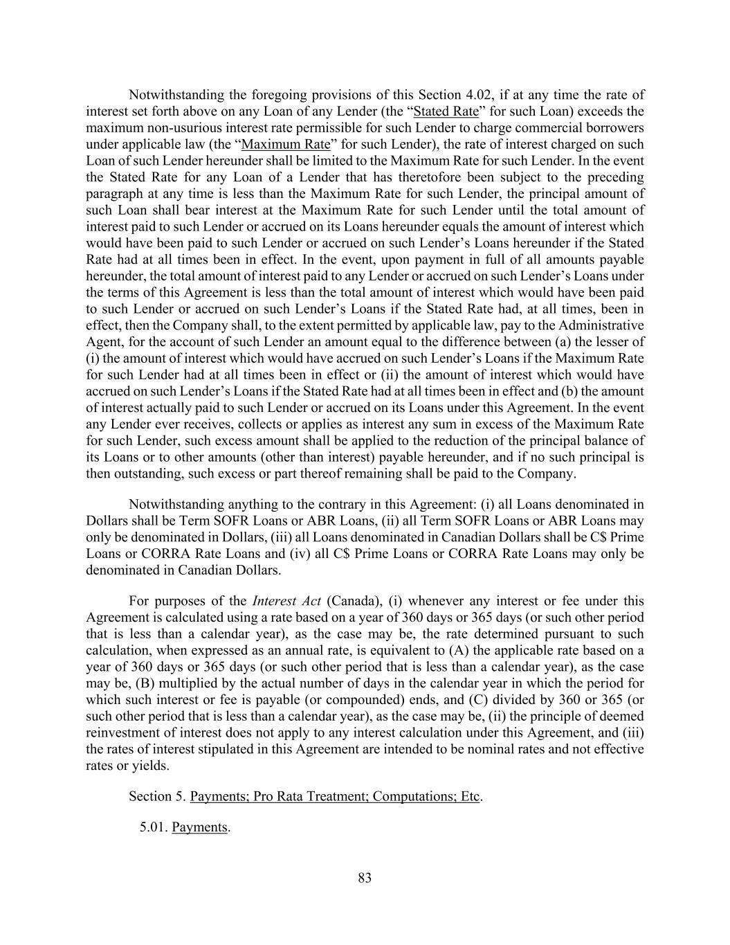 83尽管有本条第4.02条的前述规定,如果在任何时候,任何贷款人的任何贷款的上述利率(该贷款的“规定利率”)超过了适用法律允许该贷款人向商业借款人收取的最高非高利贷利率(该贷款人的“最高利率”),则该贷款人根据本协议对该贷款收取的利率应限于该贷款人的最高利率。在此之前受前款规限的贷款人的任何贷款的规定利率在任何时候低于该贷款人的最高利率的,该贷款的本金金额应按该贷款人的最高利率计息,直至支付给该贷款人或其根据本协议所借贷款应计利息总额等于如果该规定利率在任何时候都有效的情况下本应支付给该贷款人或该贷款人根据本协议所借贷款应计利息的金额。如果在全额支付根据本协议应支付的所有款项后,根据本协议条款向任何贷款人支付的利息总额或就该贷款人的贷款应计利息总额低于如果规定的利率在任何时候都有效的情况下本应支付给该贷款人或就该贷款人的贷款应计利息总额,则公司应在适用法律允许的范围内向行政代理人支付,就该贷款人而言,一笔数额相当于(a)(i)如果该贷款人的最高利率在任何时候都有效,则该贷款人的贷款应计利息数额或(ii)如果所述利率在任何时候都有效,则该贷款人的贷款应计利息数额与(b)根据本协议实际支付给该贷款人或其贷款应计利息数额之间的差额中的较小者。如任何贷款人收到、收取或申请任何超过该贷款人的最高利率的款项作为利息,则该超额款项须适用于减少其贷款的本金余额或根据本协议应付的其他款项(利息除外),如当时没有该等本金未偿还,则该超额或剩余部分须支付予公司。尽管本协议有任何相反规定:(i)所有以美元计价的贷款应为定期SOFR贷款或ABR贷款,(ii)所有定期SOFR贷款或ABR贷款只能以美元计价,(iii)所有以加元计价的贷款应为加元优惠贷款或CORRA利率贷款,以及(iv)所有加元优惠贷款或CORRA利率贷款只能以加元计价。就《利息法》(加拿大)而言,(i)每当本协议项下的任何利息或费用使用基于一年360天或365天(或少于一个日历年的其他期间)(视情况而定)的费率计算时,根据此类计算确定的费率(以年率表示)相当于(a)基于一年360天或365天(或少于一个日历年的其他期间)(视情况而定)的适用费率,(b)乘以应付(或复利)该等利息或费用的期间结束的历年的实际天数,及(c)除以360或365(或少于一个历年的其他期间)(视属何情况而定),(ii)利息当作再投资的原则不适用于本协议下的任何利息计算,及(iii)本协议规定的利率拟为名义利率而非有效利率或收益率。第5节。付款;按比例处理;计算;等5.01。付款。