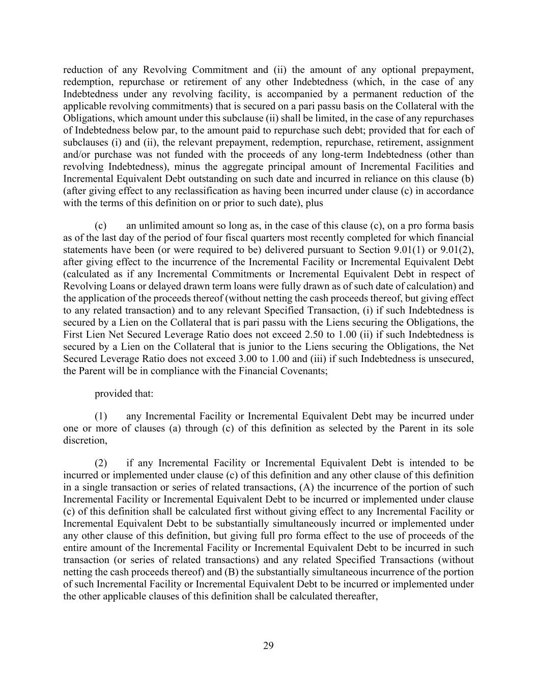 29减少任何循环承诺和(ii)任何可选择的提前偿还、赎回、回购或报废的任何其他债务(在任何循环融资项下的任何债务的情况下,伴随着适用的循环承诺的永久减少)的金额,这些债务在与债务的抵押品上以同等权益为担保,在任何低于面值的债务回购的情况下,本第(ii)款下的金额应限于为回购该债务而支付的金额;但就第(i)和(ii)款中的每一款而言,相关的提前偿还、赎回、回购,退休、转让和/或购买的资金没有来自任何长期债务(循环债务除外)的收益,减去在该日期未偿还并因依赖本条款(b)而产生的增量融资和增量等值债务的本金总额(在根据本定义的条款在该日期或之前根据(c)条发生的任何重新分类生效后),加上(c)无限金额,只要在本条款(c)的情况下,在根据第9.01(1)或9.01(2)节已经(或被要求)交付财务报表的最近完成的四个财政季度期间的最后一天,在发生增量融资或增量等值债务(计算方式如同循环贷款或延迟提取的定期贷款的任何增量承诺或增量等值债务在该计算日期已全部提取)及其收益的应用(不扣除其现金收益,但对任何相关交易)和任何相关的特定交易生效,(i)如果此类债务由抵押品上的留置权担保,该留置权与担保债务的留置权具有同等权益,则第一留置权净担保杠杆比率不超过2.50至1.00(ii)如果此类债务由抵押品上的留置权担保,该留置权低于为债务提供担保的留置权,则净担保杠杆比率不超过3.00至1.00,并且(iii)如果此类债务是无担保的,母公司将遵守财务契约;但前提是:(1)任何增量融资或增量等值债务可能会根据母公司全权酌情选择的本定义(a)至(c)条中的一项或多项条款发生,(2)如果任何增量融资或增量等值债务打算根据本定义(c)条和本定义的任何其他条款在单一交易或一系列相关交易中发生或实施,(a)根据本定义(c)条将招致或实施的该等增量融资或增量等值债务部分的发生,须先计算,而不会使根据本定义任何其他条款实质上同时招致或实施的任何增量融资或增量等值债务生效,但对在该交易(或一系列相关交易)和任何相关的特定交易(不扣除其现金收益)中将产生的全部增量融资或增量等值债务的收益的使用给予充分的形式上的效力,以及(b)根据本定义的其他适用条款将产生或实施的该增量融资或增量等值债务部分的实质上同时发生,应在此后计算,