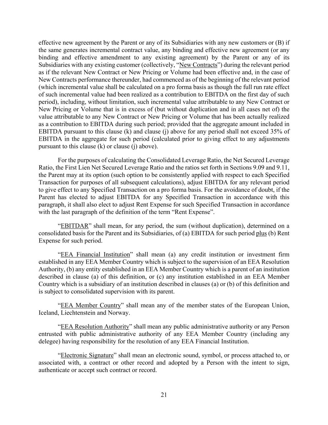 21由母公司或其任何附属公司与任何新客户订立的有效新协议,或(b)如该等协议产生增量合约价值,则由母公司或其任何附属公司于有关期间与任何现有客户订立的任何具约束力及有效的新协议(或对任何现有协议的任何具约束力及有效修订)(统称“新合同”),犹如有关新合同或新定价或数量已有效,而就根据该等协议履行新合同而言,已在相关期间开始时开始(该增量价值应按备考基础计算,如同该增量价值的全部运行率效应已在该期间的第一天作为对EBITDA的贡献实现),包括但不限于,可归因于任何新合同或新定价或数量的增量价值超过(但不重复,在所有情况下均扣除)可归因于任何新合同或新定价或数量的价值,该价值在该期间已实际实现为对EBITDA的贡献;提供任何期间根据上述第(k)条和第(j)条计入EBITDA的总额不得超过该期间EBITDA总额的35%(在根据上述第(k)条或第(j)条实施任何调整之前计算)。为计算合并杠杆比率、净担保杠杆比率、第一留置权净担保杠杆比率以及第9.09和9.11节规定的比率,母公司可自行选择(为所有后续计算的目的,该选择权应始终适用于每笔特定交易),调整任何相关期间的EBITDA,以在备考基础上使任何特定交易生效。为免生疑问,如果母公司已选择根据本款调整任何特定交易的EBITDA,则还应选择根据“租金费用”一词定义的最后一段调整该特定交易的租金费用。“EBITDA”是指,在任何期间,(a)该期间的EBITDA加上(b)该期间的租金费用的总和(不重复),在合并基础上为母公司及其子公司确定。“EEA金融机构”是指(a)在任何EEA成员国设立的受EEA决议当局监管的任何信贷机构或投资公司,(b)在EEA成员国设立的任何实体,该实体是本定义(a)条所述机构的母公司,或(c)在EEA成员国设立的任何机构,该机构是本定义(a)或(b)条所述机构的子公司,并与其母公司合并监管。“欧洲经济区成员国”是指欧盟的任何成员国,冰岛、列支敦士登和挪威。“EEA决议当局”是指负责任何EEA金融机构的决议的任何公共行政当局或受托管理任何EEA成员国公共行政当局的任何人(包括任何受权人)。“电子签名”是指附属于或与合同或其他记录相关联的、由具有签署、认证或接受该合同或记录意图的人采用的电子声音、符号或过程。