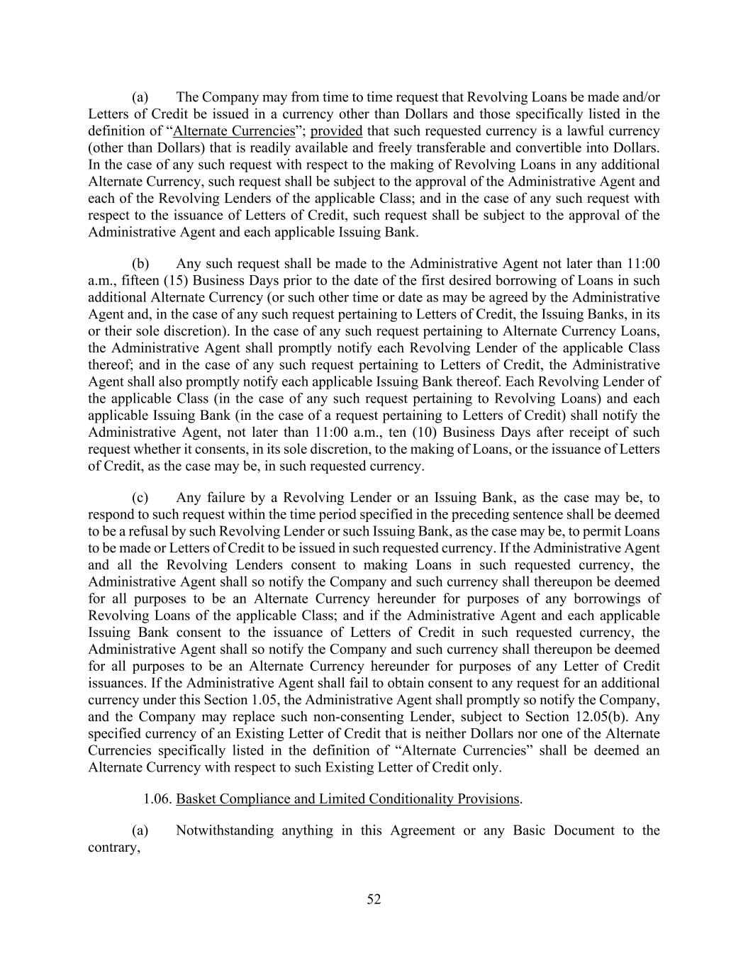 52(a)公司可不时要求以美元以外的货币和“替代货币”定义中具体列出的货币提供循环贷款和/或签发信用证;但此种要求的货币是一种可随时获得、可自由转让和可兑换成美元的合法货币(美元除外)。如就以任何额外的替代货币提供循环贷款提出任何此种请求,此种请求须经行政代理人和适用类别的每一循环贷款人批准;如就信用证的签发提出任何此种请求,此种请求须经行政代理人和每一适用的开证银行批准。(b)任何该等请求应不迟于首次希望以额外替代货币借款之日前十五(15)个工作日上午11:00(或行政代理人可能同意的其他时间或日期)向行政代理人提出,如涉及信用证的任何该等请求,则由开证银行自行决定)。对于涉及替代货币贷款的任何此类请求,行政代理人应及时将其适用类别通知各循环贷款人;对于与信用证有关的任何此类请求,行政代理人还应将其及时通知各适用开证银行。适用类别的每一循环贷款人(在涉及循环贷款的任何此类请求的情况下)和每一适用的开证银行(在涉及信用证的请求的情况下)应在收到此种请求后十(10)个工作日上午11:00之前通知行政代理人,其是否自行决定同意以所要求的货币发放贷款或签发信用证(视情况而定)。(c)循环贷款人或开证银行(视属何情况而定)未能在前一句所指明的期限内对该要求作出回应,须当作该循环贷款人或开证银行(视属何情况而定)拒绝准许以该要求的货币作出贷款或发出信用证。如行政代理人及所有循环贷款人同意以所要求的该等货币作出贷款,则行政代理人须如此通知公司,而就所有用途而言,该等货币须当作为本协议项下适用类别循环贷款的任何借款的替代货币;而如行政代理人及各适用开证行同意以所要求的该等货币签发信用证,行政代理人应将此通知公司,因此就所有目的而言,该货币应被视为本协议项下的替代货币,以用于任何信用证发行的目的。如行政代理人未能取得对根据本条第1.05条提出的任何额外货币的请求的同意,行政代理人应迅速通知公司,公司可在符合第12.05(b)条的规定下更换该非同意的贷款人。现有信用证的任何指定币种,如既不是美元,也不是“替代货币”定义中具体列出的替代货币之一,应仅被视为该现有信用证的替代货币。1.06.篮子合规和有限条件条款。(a)尽管本协定或任何基本文件有任何相反的规定,