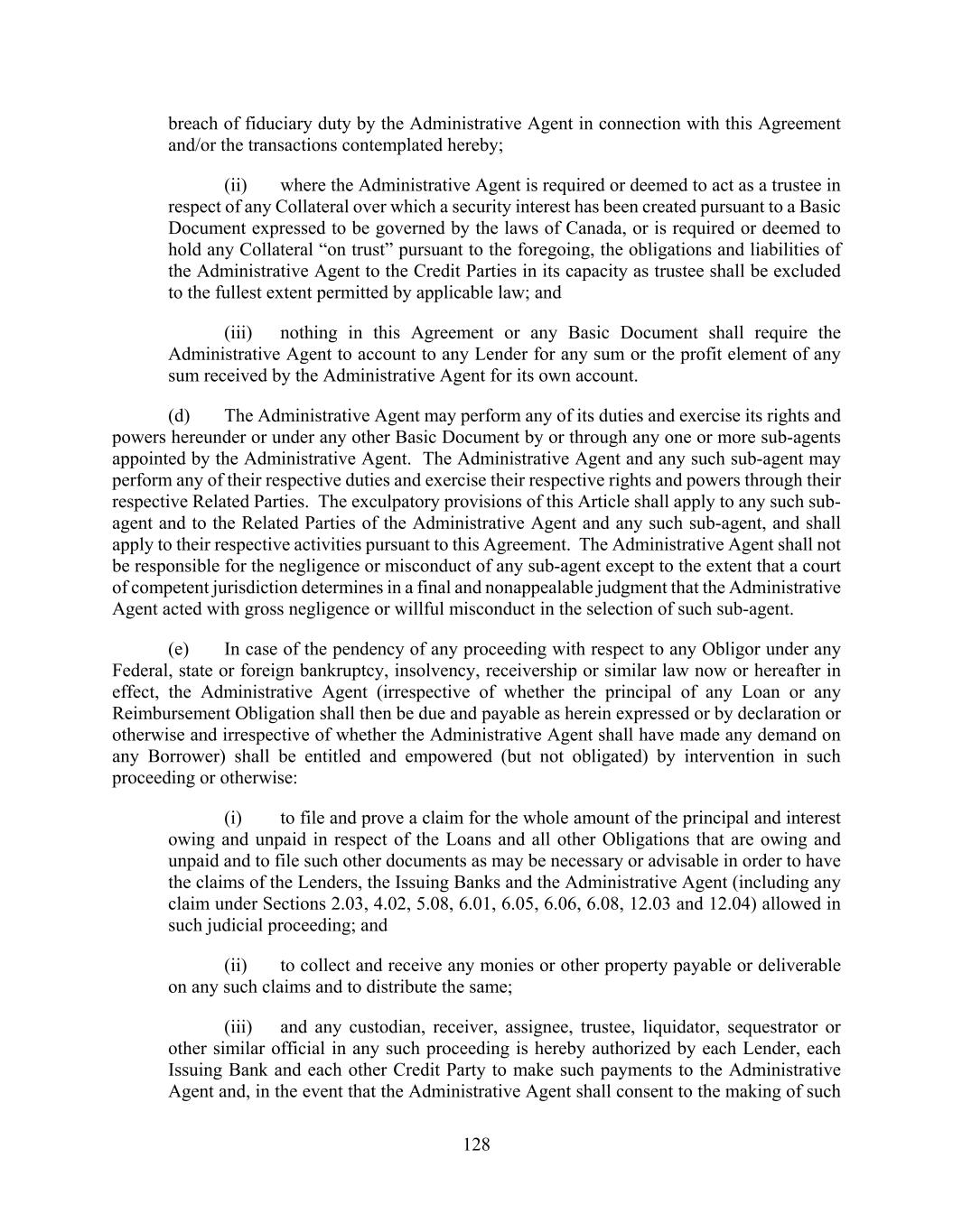 128行政代理人违反与本协议和/或本协议所设想的交易有关的受托责任;(ii)如行政代理人被要求或被视为就根据一份明示受加拿大法律管辖的基本文件设定担保权益的任何抵押品担任受托人,或被要求或被视为根据上述规定“以信托方式”持有任何抵押品,行政代理人以受托人身份对信用方承担的义务和责任,应在适用法律允许的最大范围内予以排除;(iii)本协议或任何基本文件中的任何内容均不得要求行政代理人就行政代理人为自己账户收到的任何款项或任何款项的利润部分向任何贷款人进行会计处理。(d)行政代理人可由或透过行政代理人委任的任何一名或多于一名次级代理人,履行其任何职责,并根据本协议或任何其他基本文件行使其权利及权力。行政代理人和任何此类次级代理人可以通过各自的关联方履行各自的任何职责,行使各自的权利和权力。本条免责条款适用于任何该等分代理人,适用于该行政代理人及任何该等分代理人的关联方,并适用于各自依据本协议开展的活动。行政代理人不得对任何次级代理人的过失或不当行为负责,除非有管辖权的法院在最终且不可上诉的判决中确定该行政代理人在选择该次级代理人时存在重大过失或故意不当行为。(e)如根据现行或以后有效的任何联邦、州或外国破产、无力偿债、接管或类似法律就任何债务人进行的任何程序处于未决状态,行政代理人(不论任何贷款或任何偿还义务的本金随后是否按本协议所述或通过声明或其他方式到期应付,亦不论该行政代理人是否已向任何借款人提出任何要求)均有权(但无义务)通过干预该程序或其他方式:(i)提出并证明就贷款和所有其他义务所欠和未付的本金和利息的全部金额提出索赔为使贷款人、开证银行和行政代理人的债权(包括根据第2.03、4.02、5.08、6.01、6.05、6.06、6.08、12.03和12.04条提出的任何债权)在该司法程序中被允许而拖欠和未付,并提交可能必要或可取的其他文件;以及(ii)收取任何此类债权应付或可交付的任何款项或其他财产并进行分配;(iii)以及在任何此类程序中的任何保管人、接管人、受让人、受托人、清盘人、扣押人或其他类似官员特此获各贷款人授权,各开证银行及相互授信方向行政代理人支付该等款项,并在行政代理人同意支付该等款项的情况下