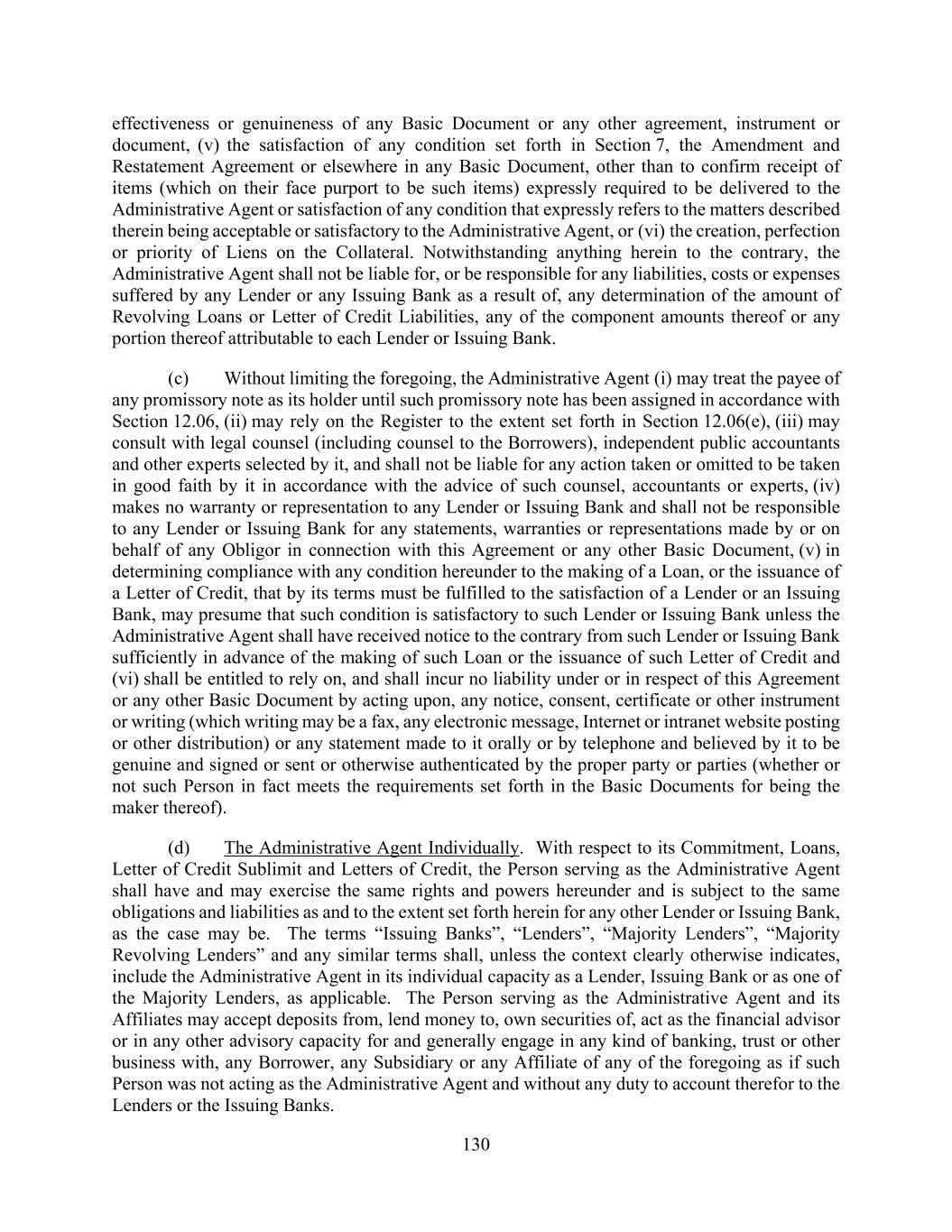 130任何基本文件或任何其他协议、文书或文件的有效性或真实性,(v)满足第7条、修订和重述协议或任何基本文件其他地方规定的任何条件,但确认收到明确要求交付给行政代理人的物品(表面上看来是此类物品)或满足明确提及其中所述事项为行政代理人可以接受或满意的任何条件,或(vi)担保物上留置权的设定、完善或优先权除外。尽管本文有任何相反的规定,行政代理人不对任何贷款人或任何开证银行因任何确定循环贷款或信用证负债的数额、其任何组成部分数额或其任何部分归属于每一贷款人或开证银行而承担的任何责任、成本或开支承担责任或承担责任。(c)在不限制前述规定的情况下,行政代理人(i)可将任何本票的收款人视为其持有人,直至该本票根据第12.06条转让为止;(ii)可在第12.06(e)条规定的范围内依赖登记册,(iii)可咨询法律顾问(包括借款人的顾问)、独立公共会计师和其选定的其他专家,并不对其根据该等顾问、会计师或专家的意见善意采取或不采取的任何行动承担责任,(iv)不向任何贷款人或开证行作出任何保证或陈述,亦不对任何贷款人或开证行就任何债务人或其代表就本协议或任何其他基本文件作出的任何陈述、保证或陈述负责,(v)在确定符合根据本协议作出贷款或签发信用证的任何条件时,即根据其条款必须达成令贷款人或开证行满意的条件,可推定该等条件令该贷款人或开证银行满意,除非行政代理人在作出该等贷款或发出该等信用证之前已充分收到该贷款人或开证银行的相反通知,且(vi)有权依赖本协议或任何其他基本文件,并不会因采取行动而根据或就本协议或任何其他基本文件承担任何责任,任何通知、同意书、证书或其他文书或书面(书面可为传真、任何电子电文,互联网或内网网站登载或以其他方式分发)或以口头或电话方式向其作出并被其认为是真实的并由适当一方或多方签署或发送或以其他方式认证的任何陈述(不论该人事实上是否符合《基本文件》中规定的作为其制订者的要求)。(d)行政代理人个人。就其承诺、贷款、信用证分限额和信用证而言,担任行政代理人的人应享有并可能行使本协议项下的相同权利和权力,并承担与本协议规定的任何其他贷款人或开证银行(视情况而定)相同的义务和责任,并在本协议规定的范围内。“发行银行”、“贷款人”、“多数贷款人”、“多数循环贷款人”及任何类似术语,除文意另有所指外,均应包括以贷款人、发行银行或多数贷款人之一的个人身份的行政代理人(如适用)。担任行政代理人及其附属机构的人,可以接受来自任何借款人、任何附属公司或任何上述任何一项的任何银行、信托或其他附属机构的存款、出借款项、拥有证券、担任财务顾问或以任何其他顾问身份,并一般从事任何种类的银行、信托或其他业务,犹如该人并非担任行政代理人一样,亦无须向贷款人或发行银行交代有关情况。
