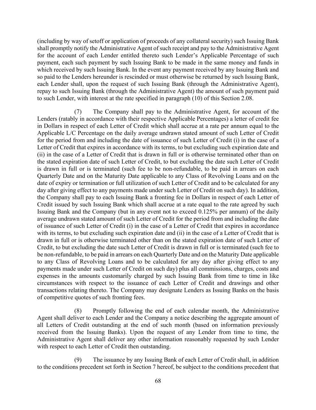 68(包括以抵销或运用任何担保证券的收益的方式)该开证行应将此种收款及时通知行政代理人,并向该行政代理人支付有权享有此种付款权利的每一贷款人的该等付款的适用百分比,该开证行的每一笔该等付款应与该开证行收到的款项和资金相同。如任何开证行收到并根据本协议向贷款人支付的任何款项被撤销或必须由该开证行以其他方式归还,则各贷款人应应该开证行(通过行政代理人)的请求,向该开证行(通过行政代理人)偿还已支付给该贷款人的该等款项的金额,并按本条第2.08条第(10)款规定的利率计息。(7)公司须就每份信用证向行政代理人支付(按贷款人各自适用的百分数按比例)的美元信用证费用,该费用须按相当于自该信用证(i)签发之日(包括该日)该信用证的日均未提取金额的适用信用证百分数的年费率累计,如该信用证根据其条款到期,至但不包括该到期日;及(ii)如信用证已全数提款或以其他方式终止,但并非在该信用证的指明到期日,则至但不包括该信用证已全数提款或终止的日期(该等费用不可退还,将在每个季度日期及适用于任何类别循环贷款的到期日期,以及在该信用证到期或终止或全部使用之日支付欠款,并将在该日期根据该信用证支付的任何款项生效后的任何一天计算)。此外,公司须就该开证行签发的每份信用证向各开证行支付以美元为单位的垫付费用,该费用应按该开证行与公司商定的利率(但在任何情况下均不得超过该信用证自该信用证签发之日起(包括该日)期间的日均未提取金额的0.125%(如该信用证根据其条款到期,至但不包括该到期日;及(ii)如信用证已全数提款或以其他方式终止,但该信用证的指明到期日除外,则至但不包括该信用证已全数提款或终止的日期(该等费用不可退还,将于每个季度日期及适用于任何类别循环贷款的到期日支付欠款,并将于该日期根据该信用证支付的任何款项生效后的任何一天计算)加上该开证银行在类似情况下不时就每份信用证和提款的签发及与此有关的其他交易按惯例收取的所有佣金、费用、成本和开支。公司可根据此类门面费的竞争性报价指定贷款人为发行银行。(8)在每个日历月结束后,行政代理人应迅速向每个贷款人和公司交付一份通知,说明该月底所有未结信用证的总额(以先前从开证银行收到的信息为基础)。应任何贷款人不时提出的要求,行政代理人应交付该贷款人合理要求的与当时未结清的每一份信用证有关的任何其他信息。(9)任何开证银行对每份信用证的签发,除本条例第7条所列的先决条件外,亦须受以下先决条件的规限: