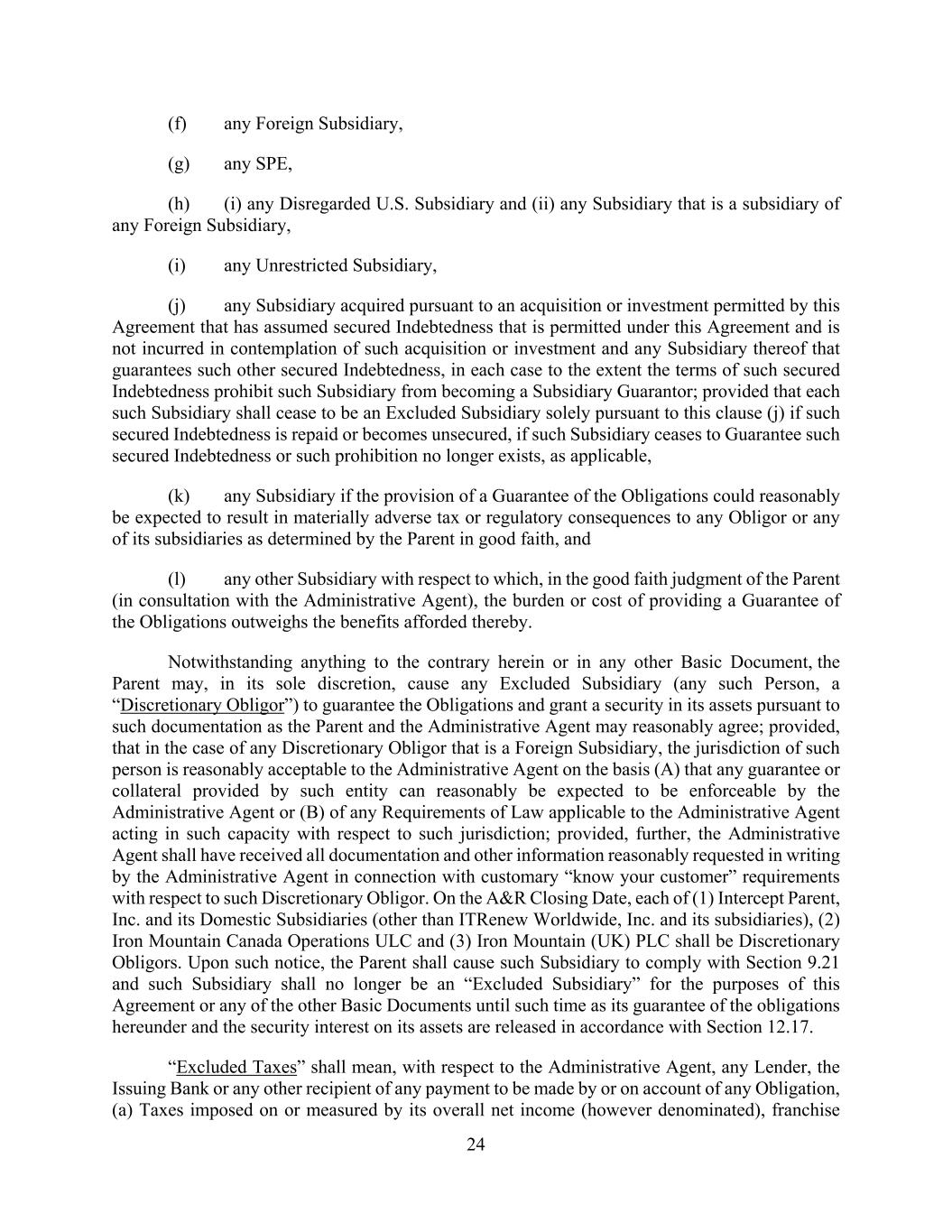 24(f)任何外国子公司,(g)任何SPE,(h)(i)任何被忽视的美国子公司和(ii)任何属于任何外国子公司的子公司,(i)任何不受限制的子公司,(j)根据本协议允许的收购或投资获得的任何子公司承担了本协议允许的有担保债务,并且在考虑进行此类收购或投资时没有发生,以及其为此类其他有担保债务提供担保的任何子公司,在每种情况下,只要此类有担保债务的条款禁止该子公司成为子公司担保人;但如果此类有担保债务得到偿还或成为无担保的,如果该子公司停止为此类有担保债务提供担保或此类禁令不再存在(如适用),则每一此类子公司应仅根据本(j)条不再是被排除的子公司,(k)任何附属公司,如果提供债务担保可以合理地预期会对任何债务人或其任何附属公司造成重大不利的税务或监管后果,由母公司善意确定,以及(l)根据母公司的善意判断(与行政代理人协商),对其提供债务担保的负担或成本超过由此提供的利益的任何其他附属公司。尽管在此或任何其他基本文件中有任何相反的规定,母公司可全权酌情促使任何被排除在外的子公司(任何此类人,“全权债务人”)根据母公司和行政代理人可能合理同意的文件为其债务提供担保并在其资产中授予担保;但就任何全权债务人而言,如果是外国子公司,基于(a)可以合理预期该实体提供的任何担保或担保物可由行政代理人强制执行,或(b)适用于以该身份行事的行政代理人就该管辖权提出的任何法律要求;此外,前提是该行政代理人应已收到行政代理人就该全权委托义务人的惯常“了解您的客户”要求以书面合理要求的所有文件和其他信息。在A & R截止日,(1)Intercept Parent,Inc.及其国内子公司(ITRenew Worldwide,Inc.及其子公司除外)、(2)铁山加拿大运营公司ULC和(3)铁山(英国)PLC各自应为全权委托义务人。在收到此种通知后,母公司应促使该子公司遵守第9.21条的规定,并且就本协议或任何其他基本文件而言,该子公司不再是“被排除的子公司”,直至其对本协议项下义务的担保及其资产上的担保权益根据第12.17条解除。“不征税”是指,就行政代理人而言,任何贷款人、开证银行或任何其他由任何债务支付或因任何债务而支付的任何款项的收款人,(a)对其整体净收益(无论如何计价)征收或计量的税款,专营权