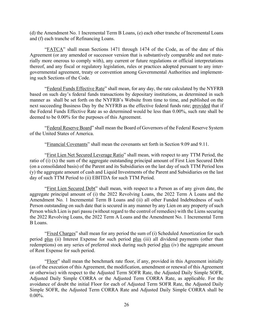 26(d)第1号修订的增量定期B贷款,(e)彼此的一批增量贷款和(f)每一批再融资贷款。“FATCA”是指《守则》第1471至1474条,截至本协议之日(或任何实质上具有可比性且不是更繁琐的遵守),任何当前或未来的法规或对其的官方解释,以及根据政府当局之间的任何政府间协议、条约或公约以及执行《守则》这些条款而通过的任何财政或监管立法、规则或做法。“联邦基金有效利率”是指,在任何一天,由NYFRB根据存托机构当天的联邦基金交易计算的利率,按NYFRB网站不时规定的方式确定,并由NYFRB在下一个营业日公布为有效联邦基金利率;但如果如此确定的联邦基金有效利率将低于0.00个百分点,则就本协议而言,该利率应被视为0.00个百分点。“联邦储备委员会”是指美利坚合众国联邦储备系统的理事会。“财务契约”是指第9.09和9.11节中规定的契约。“第一留置权净有担保杠杆率”是指,就任何TTM期间而言,(i)(x)母公司及其子公司在该TTM期间最后一天的第一留置权有担保债务(以综合基准计算)的未偿本金总额之和减去(y)母公司及子公司在该TERM2期间最后一天的现金和流动资金投资总额与(ii)该TTM期间EBITDA的比率。“第一留置权担保债务”就任何特定日期的人而言,是指(i)2022年循环贷款、2022年A期贷款和修订第1号增量B期贷款的本金总额,以及(ii)该人在该日期未偿还的所有其他已融资债务,该债务以任何方式由该人的任何财产上的任何留置权担保,而该留置权与2022年循环贷款担保的留置权(不考虑补救措施的控制权)是同等的,2022年A期贷款及修订第1号增量B期贷款。“固定费用”是指任何期间的(i)该期间的预定摊销加上(ii)该期间的利息费用加上(iii)该期间任何系列优先股的所有股息支付(赎回除外)加上(iv)该期间的租金费用总额之和。“下限”是指本协议最初(截至本协议执行、本协议的修改、修订或续签或其他)就调整后期限SOFR利率、调整后的每日简单SOFR、调整后的每日简单CORRA或调整后期限CORRA利率(如适用)规定的任何基准费率下限。为免生疑问,每一调整后期限SOFR利率的初始下限,调整后的每日简单SOFR、调整后的期限CORRA利率和调整后的每日简单CORRA应为0.00个百分点。