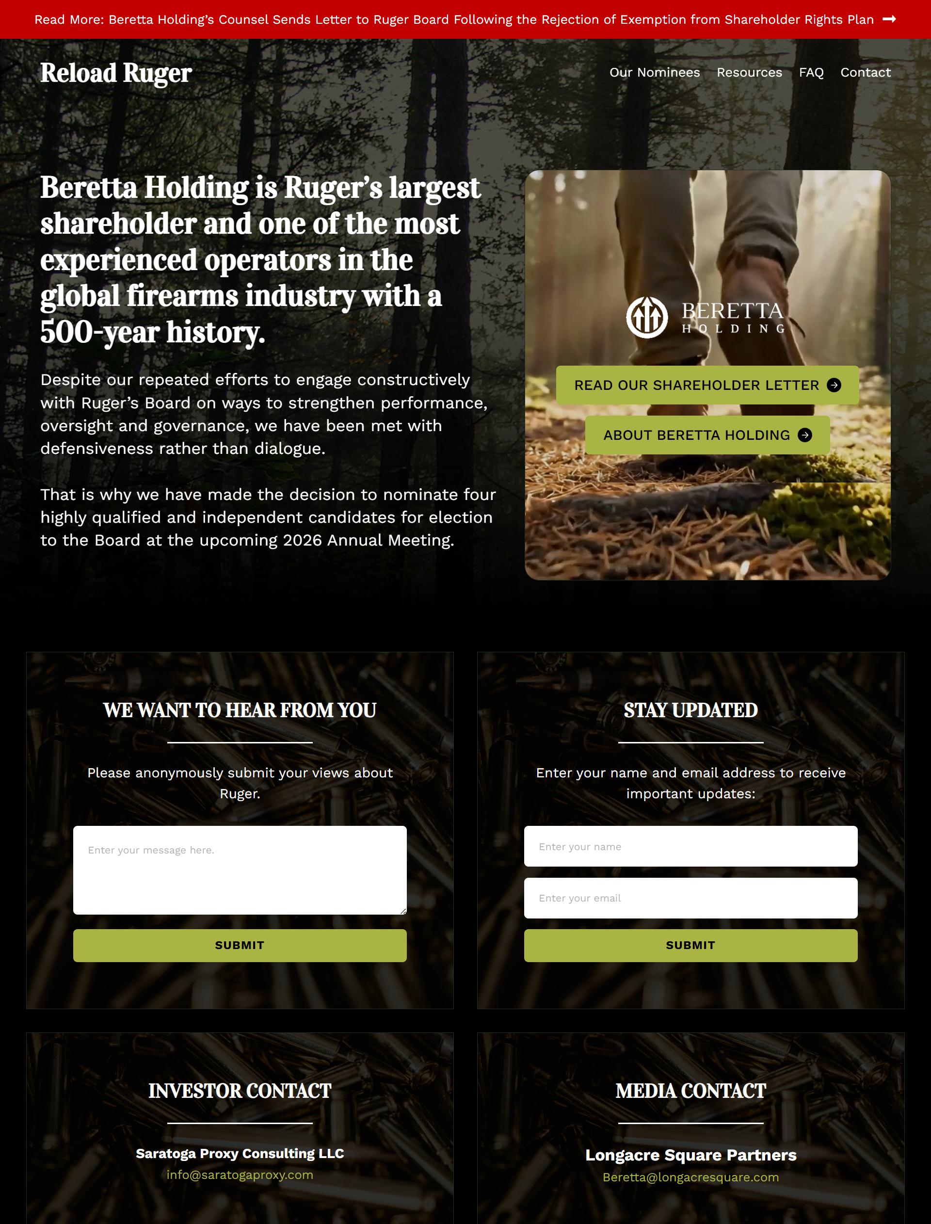 卢森堡——(商业新闻)—Beretta Holding S.A.(简称“Beretta Holding”或“我们”),是一家家族经营的集团公司,在全球高端轻武器、光学设备及弹药领域处于领先地位。该公司还是Sturm, Ruger & Company, Inc.(简称“Ruger”或“本公司”)的最大股东,持有该公司9.95%的股份。今天,Beretta Holding向Ruger的董事会发送了一封信函,回应了董事会于3月28日发出的通知,拒绝接受Beretta Holding关于免除股东权利计划的请求。