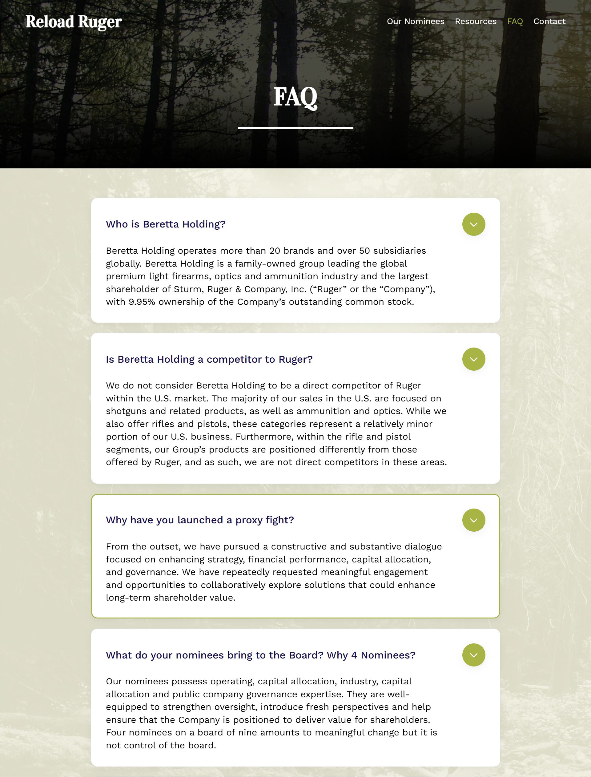 贝雷塔控股公司对公司回应的解读表明,该董事会更关心的是如何保护自己,而非为公司未来的成功奠定基础,从而让公司的股东获得最大的价值。我们两家客户在对待Ruger未来发展的方式上存在着显著差异,这一情况显然令人担忧,也可能会对公司的股东和关键利益相关者造成负面影响。贝雷塔控股已经采取具体措施来更好地服务于公司的股东利益,他们愿意支付更高的报酬来与股东共同投资。而原来的董事会成员则拥有数十年时间来与股东合作,但他们却浪费了这一机会,同时还收取了巨额董事会薪酬。Ruger的股东理应得到更好的待遇。