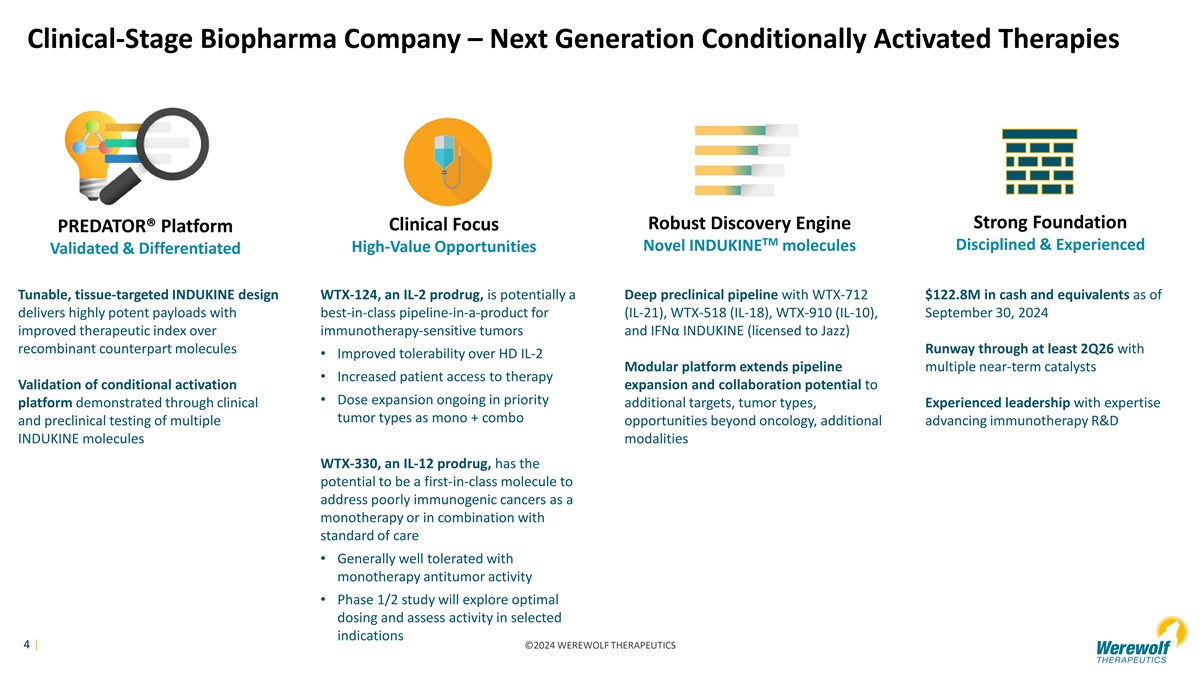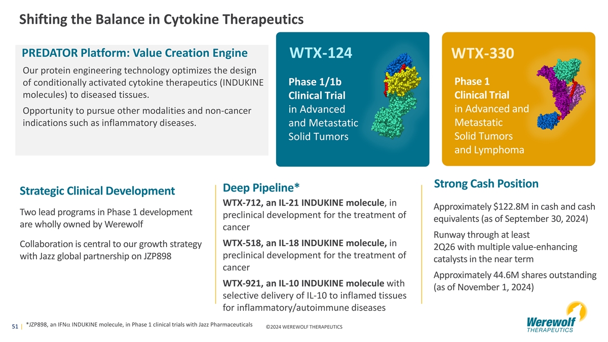 Cytokine Therapeutics PredATOR Platform:Value Creation Engine WTX-124 WTX-330我们的蛋白质工程技术优化了条件激活细胞因子疗法(INDUKINE Phase 1/1b分子)对病变组织的设计阶段1。临床试验临床试验在晚期和在晚期机会追求其他模式和非癌适应症,如炎症性疾病。转移性和转移性实体瘤实体瘤和淋巴瘤强劲的现金状况深管道*战略临床开发WTX-712,一种IL-21 INDUKINE分子,现金和现金约为1.228亿美元用于治疗等价物的1期开发临床前开发的两个牵头项目(截至2024年9月30日)由Werewolf Cancer Runway通过至少WTX-518(一种IL-18 INDUKINE分子)在合作中全资拥有,这是我们增长战略的核心,2Q26与Jazz全球合作开发JZP898催化剂治疗近期癌症的多个价值增强临床前开发约4460万股流通在外的WTX-921,具有(截至2024年11月1日)向炎症组织选择性递送IL-10的IL-10 INDUKINE分子,用于炎症/自身免疫性疾病*JZP898,一种IFN α INDUKINE分子,与爵士制药 51处于1期临床试验中|©2024年狼人疗法