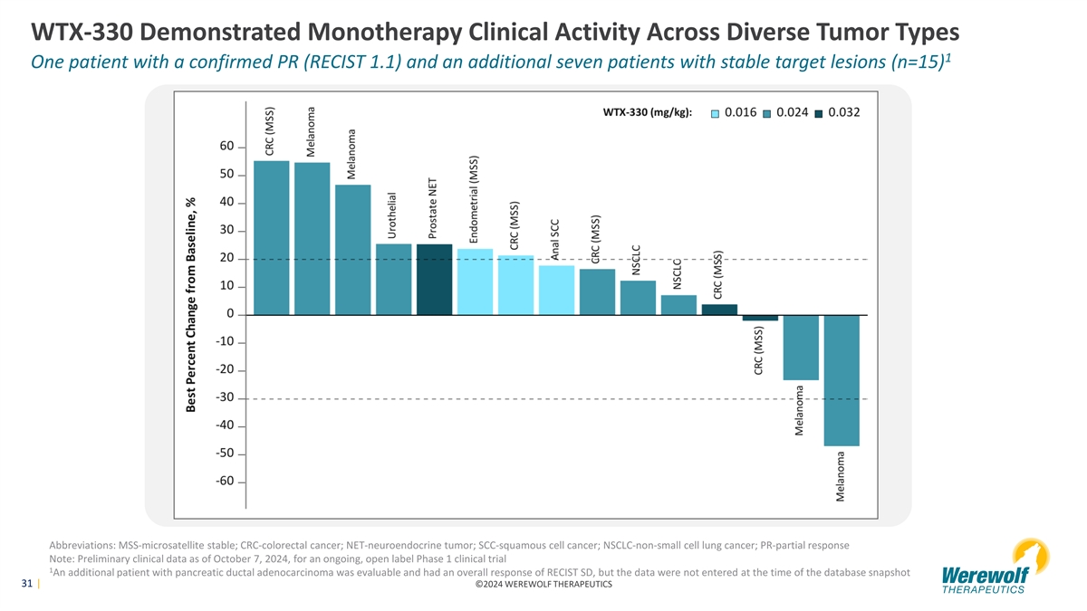 跨实体瘤适应症临床抗肿瘤活性的早期迹象转移性皮肤黑色素瘤微卫星稳定性结直肠癌(MSS CRC)和其他胃肠道恶性肿瘤• 76岁女性弥漫性黑色素瘤转运转移患者,在辅助治疗中进展• 50岁男性,在7种先前的派姆单抗治疗中进展达到证实PR(RECIST治疗线,包括研究性1.1)16周免疫疗法24周疾病稳定• 77岁女性黑色素瘤患者• 61岁女性患者在SOC治疗中进展停用ipilimumab和nivolumab因化疗联合贝伐珠单抗毒性稳定目标病灶减少24%(12周持续发病16周)• 74岁胰腺导管腺癌患者,SOC化疗和放射治疗进展,8周首次再分期扫描显示目标病灶无增长,非目标病灶无增加(患者持续)简称:PR-部分应答;MSS-microsatellite稳定;CRC-结直肠癌;GI-胃肠道;SOC-护理标准30 |©2024年狼人疗法