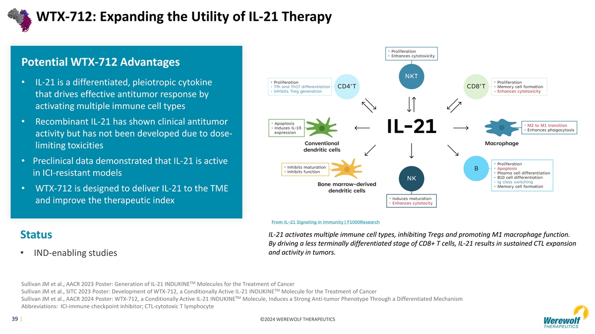 WTX-712:扩大IL-21治疗的效用潜力WTX-712优势• IL-21是一种分化的多效性细胞因子,通过激活多种免疫细胞类型来驱动有效的抗肿瘤反应•重组IL-21已显示出临床抗肿瘤活性,但由于剂量限制性毒性尚未开发•临床前数据表明IL-21在ICI耐药模型中具有活性• WTX-712旨在将IL-21递送至TME,并从IL-21信号在免疫中改善治疗指数| F1000Research IL-21激活多种免疫细胞类型,抑制Treg,促进F1巨噬细胞功能。状态通过驱动CD8 + T细胞的较少终末分化阶段,IL-21导致肿瘤中持续的CTL扩增和活性。• IND赋能研究TM Sullivan JM等人,AACR2023海报:IL-21 INDUKINE分子的生成用于治疗癌症TM分子治疗癌症Sullivan JM等人,SITC 2023海报:WTX-712的开发,一种有条件活性的IL-21 INDUKINE TM分子,通过分化机制诱导强抗肿瘤表型Sullivan JM等人,AACR2024海报:WTX-712,一种有条件活性的IL-21 INDUKINE缩写:ICI-免疫检查点抑制剂;CTL-细胞毒性T淋巴细胞39 |©2024年狼人疗法