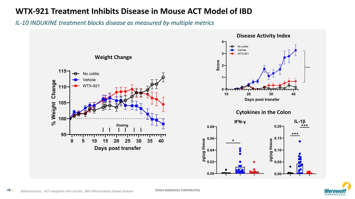 WTX-921治疗在小鼠ACT模型中抑制疾病的IBD IL-10 INDUKINE治疗阻断疾病经多指标测量疾病活动指数4无结肠炎车辆WTX-921 3体重变化2****115无结肠炎1车WTX-921 110010203040天转运后105细胞因子在结肠中100 IL-1 β IFN-γ给药丨丨0.20 0.08丨丨950.06 0.15丨05 10152025303540天转运后0.04 0.10 0.02 0.05 0.00 0.0048 |©2024 WEREWOLF THERAPEUTICS缩写:ACT-过继细胞转移;IBD-炎症性肠病%体重变化pg/μ g组织评分pg/μ g组织