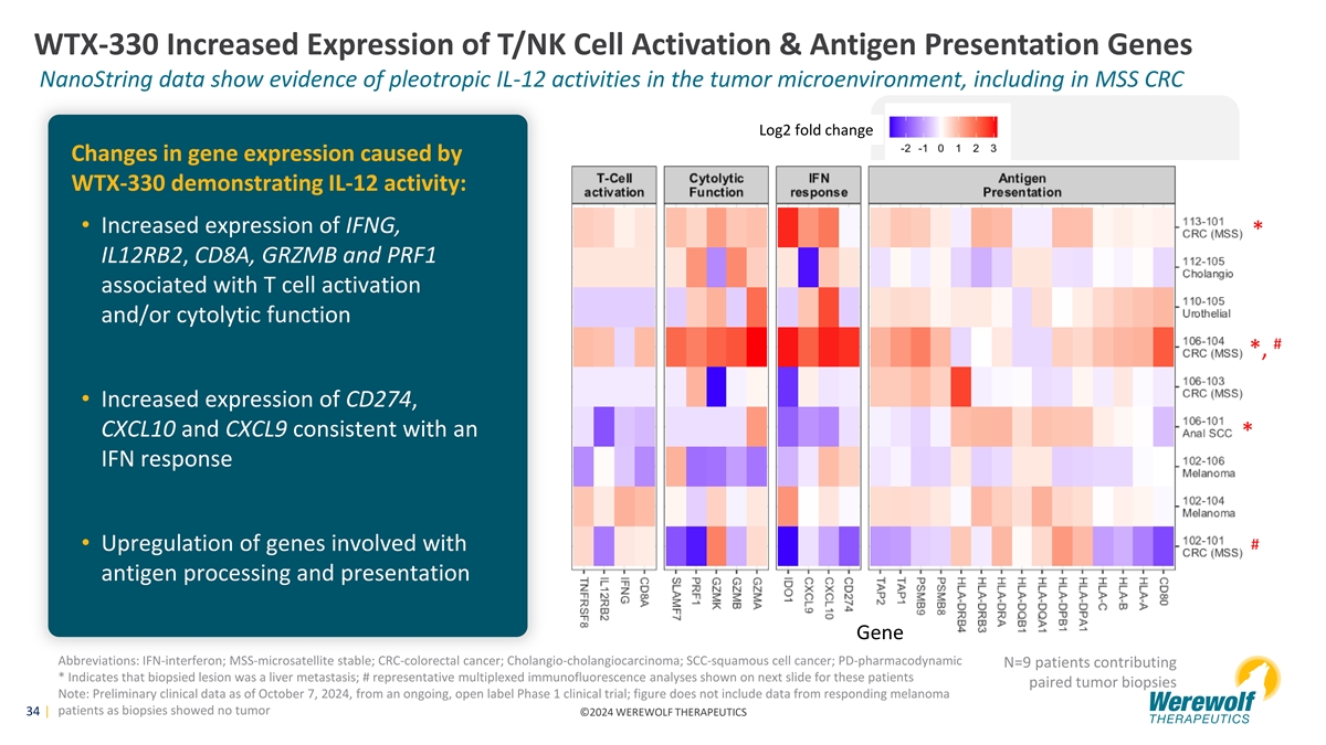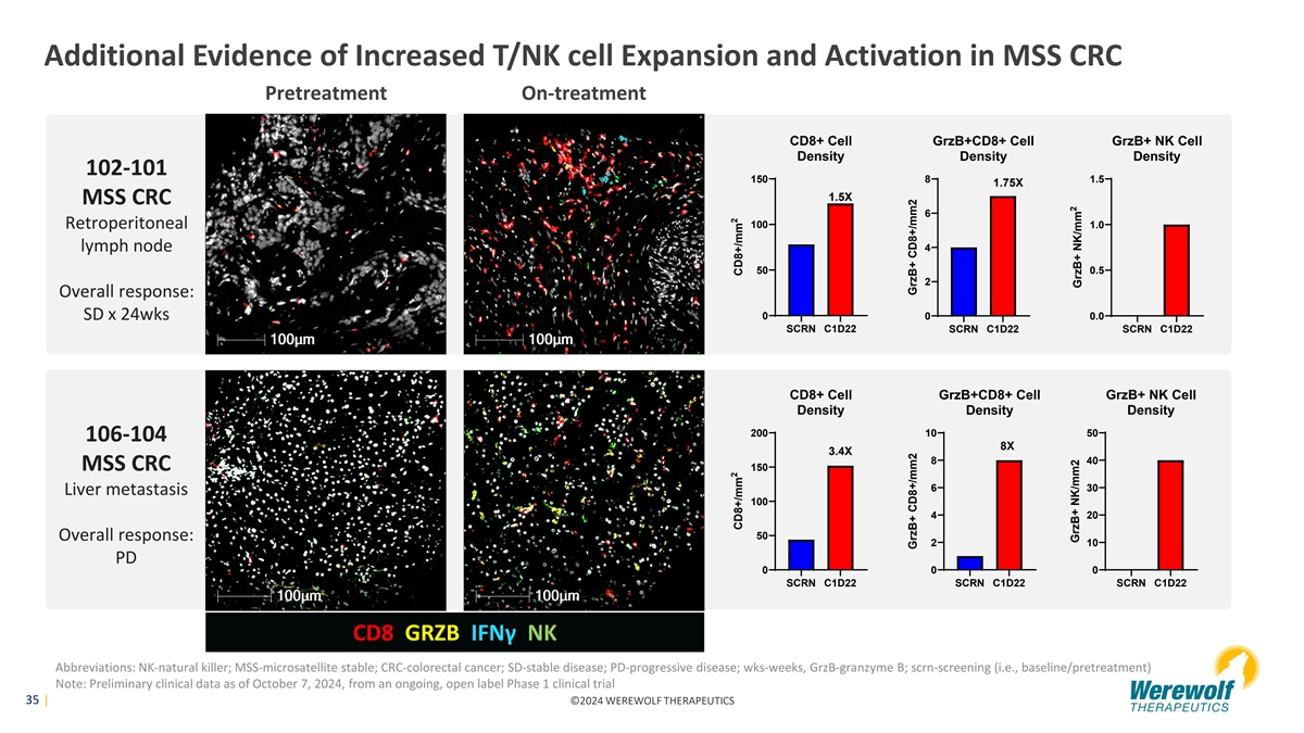 WTX-330增加T/NK细胞活化和抗原呈递基因的表达NanoString数据显示肿瘤微环境中多效性IL-12活性的证据,包括在MSS CRC log2倍变化中,由WTX-330引起的基因表达变化显示IL-12活性:• IFNG表达增加,*与T细胞活化和/或溶细胞功能相关的IL12RB2、CD8A、GRZMB和PRF1 #*,• CD274表达增加,CXCL10和CXCL9符合an*IFN反应# •与抗原加工和呈递有关的基因上调基因简称:IFN-干扰素;MSS-微卫星稳定;CRC-结直肠癌;胆管胆管癌;SCC-鳞癌;PD-药效学N = 9例患者贡献*表示活检病变为肝脏转移;#这些患者配对肿瘤活检的下一张幻灯片上显示的代表性多路免疫荧光分析注:截至2024年10月7日的初步临床数据,来自一项正在进行的开放标签1期临床试验;该数字不包括来自有反应的黑色素瘤患者的数据,因为活检显示没有肿瘤34 |©2024年狼人疗法