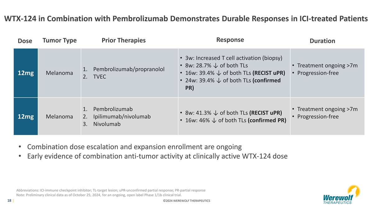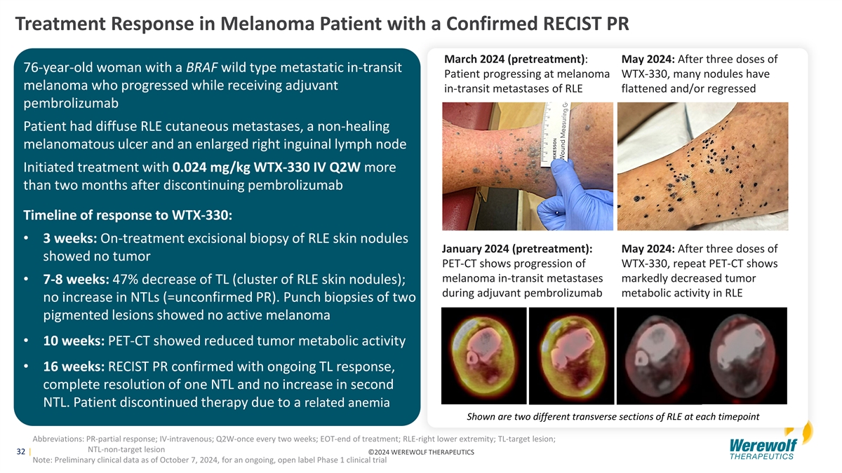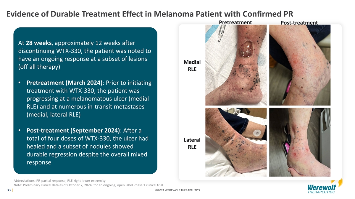 证实PR预处理的黑色素瘤患者治疗后的持久治疗效果证据在停用WTX-330大约12周后的28周,注意到患者在内侧(关闭所有治疗)的一个病灶子集有持续的反应RLE •预处理(2024年3月):在开始使用WTX-330治疗之前,患者在黑色素瘤溃疡(内侧RLE)和许多在途转移(内侧、外侧RLE)处进展•治疗后(2024年9月):在总共四剂WTX-330后,溃疡已横向愈合,尽管总体混合反应,但仍有一部分结节显示RLE持久消退;;简称:PR-部分反应;RLE-右下肢注:截至2024年10月7日的初步临床数据,用于正在进行的开放标签1期临床试验33 |©2024年狼人疗法
