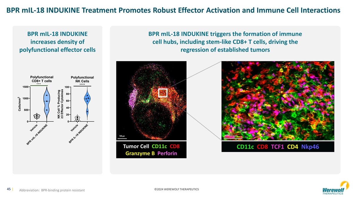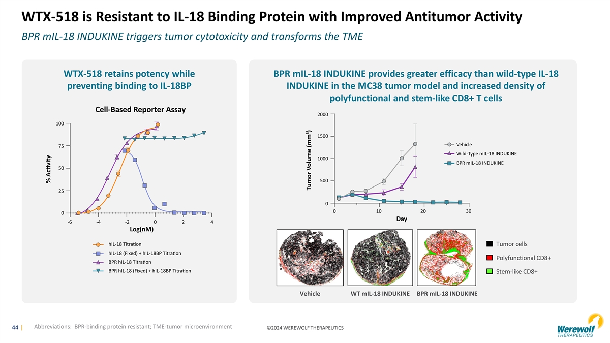 WTX-518对IL-18结合蛋白具有抗性,具有更好的抗肿瘤活性BPR mIL-18 INDUKINE引发肿瘤细胞毒性并转化TME WTX-518保留效力,而BPR mIL-18 INDUKINE在MC38肿瘤模型中提供比野生型IL-18更强的功效,可防止与IL-18BP INDUKINE结合,并增加多功能和干细胞样CD8 + T细胞肿瘤细胞多功能CD8 +干基样CD8 +载体WTmIL-18 INDUKINE BPR mIL-18 INDUKINE简称:BPR结合蛋白耐药;TME-肿瘤微环境44 |©2024年狼人疗法
