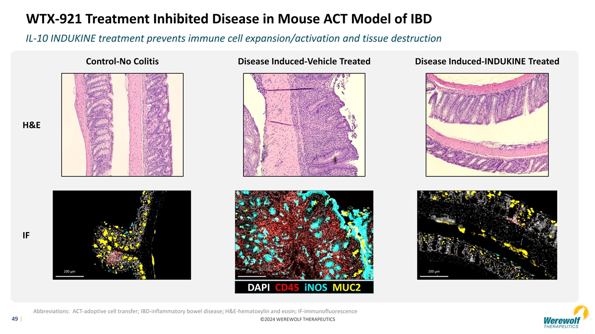 WTX-921治疗抑制病在小鼠ACT模型的IBD IL-10 INDUKINE治疗阻止免疫细胞扩增/活化和组织破坏控制-无结肠炎疾病诱导-载体治疗疾病诱导-INDUKINE治疗的H & E IF DAPI CD45 iNOS MUC2简称:ACT-过继细胞转移;IBD-炎症性肠病;H & E-苏木精和伊红;IF-免疫荧光49 |©2024年狼人疗法
