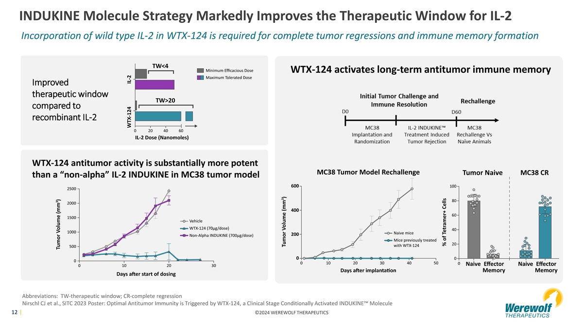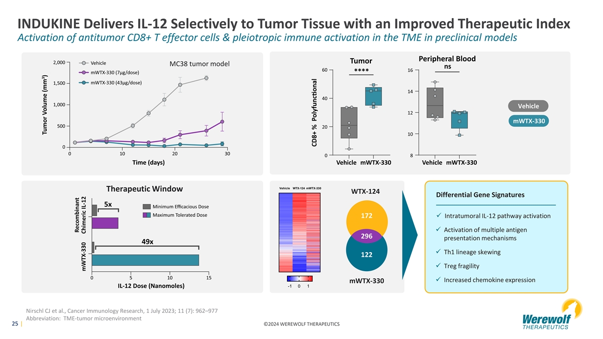 INDUKINE选择性递送IL-12至肿瘤组织具有改善的抗肿瘤CD8 + T效应细胞的治疗指数激活&临床前模型中TME中的多效性免疫激活MC38肿瘤模型载体mWTX-330载体WTX-124 mWTX-330治疗窗口WTX-124差异基因签名172 ü瘤内IL-12通路激活ü激活多个抗原296呈递机制ü th1谱系倾斜122 ü treg脆弱性ü增加的趋化因子表达mWTX-330-1 01 Nirschl CJ等人,癌症免疫学研究,2023年7月1日;11(7):962 – 977简称:TME-肿瘤微环境25 |©2024年狼人疗法