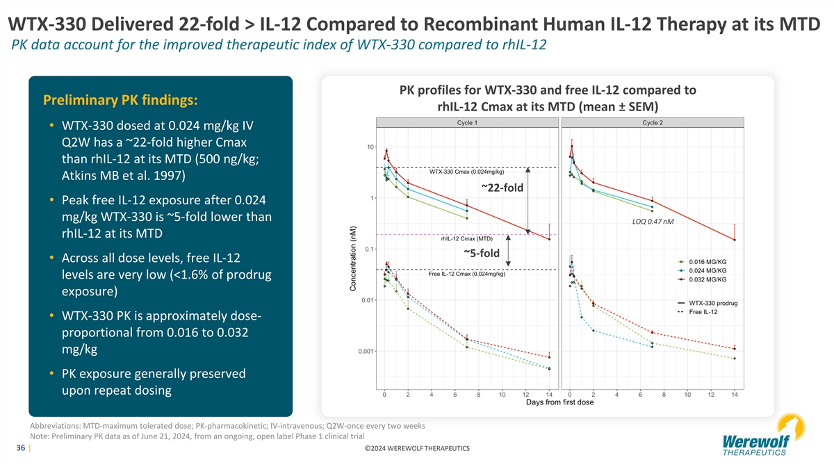 与重组人IL-12疗法相比,WTX-330在其MTD时递送的IL-12是22倍> PK数据说明了WTX-330与RTX-330和游离IL-12的rhIL-12相比治疗指数的改善与初步PK发现:在其MTD(mean ± SEM)下的rhIL-12 CAmax •在其MTD(500ng/kg;Atkins MB等人1997)下,以0.024mg/kg WTX-330给药的CTX-330的CAmax比rhIL-12的CAmax高约22倍~22倍•在所有剂量水平上,0.024mg/kg WTX-330后的峰值游离IL-12暴露比LOQ0.47nM rhIL-12在其TERM3~5倍•在所有剂量水平上游离IL-12水平非常低(<前体药物暴露的1.6%)• WTX-330 PK大约是0.016至0.032 mg/kg的剂量比例•重复给药时一般保留的PK暴露简称:MTD最大耐受剂量;PK药代动力学;IV-静脉注射;Q2-每两周一次注:截至2024年6月21日的初步PK数据,来自正在进行的开放标签1期临床试验36 |©2024年狼人疗法