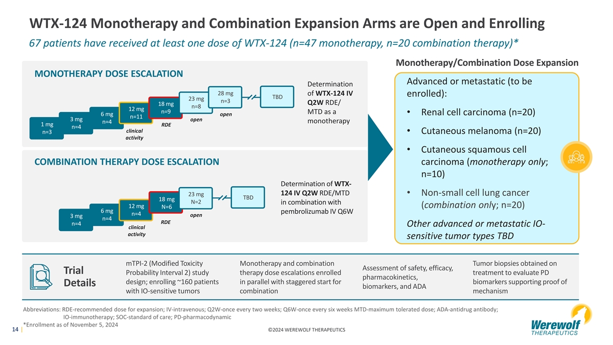 WTX-124单药和联合扩臂开放,入组67例患者已接受至少一剂WTX-124(n = 47单药,n = 20联合疗法)*单药/联合剂量扩大单药剂量递增晚期或转移性(待定28mg WTX-124 IV入组):待定23mg n = 3 Q2W RDE/18mg n = 812mg n = 9 MTD作为•肾细胞癌(n = 20)6mg开放n = 113mg开放单药治疗n = 41mg RDEn = 4临床n = 3•皮肤黑色素瘤(n = 20)活性•皮肤鳞状细胞联合治疗剂量升级性癌(仅单药治疗;n = 10)WTX-124 IV Q2W RDE/MTD 23mg的测定•非小细胞肺癌TBD18mg N = 2联合12mg(仅联合使用;n = 20)N = 66mg派姆单抗IV Q6W n = 4open 3mg n = 4RDEn = 4其他晚期或转移性IO-临床活性敏感肿瘤类型TBD mTPI-2(修饰毒性单药治疗以及在评估安全性、有效性、试验概率区间2)上获得的联合肿瘤活检)研究治疗剂量递增入组治疗以评估PD药代动力学、设计;以支持细节证明的生物标志物的交错开始平行招募约160名患者,以及与IO敏感肿瘤组合机制的ADA简称:RDE-推荐剂量扩大;IV-静脉注射;Q2W-每两周一次;Q6W-每六周一次MTD最大耐受剂量;ADA-抗药物抗体;IO-免疫治疗;SOC-护理标准;PD-药效学*截至2024年11月5日招生人数14 |©2024年狼人疗法