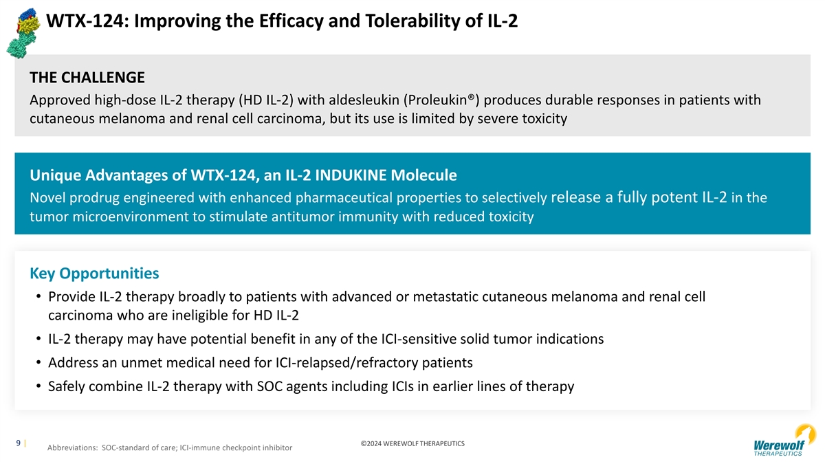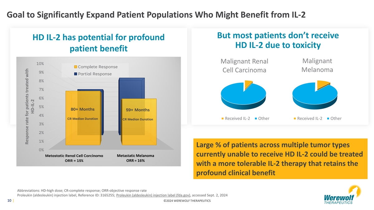 WTX-124:提高IL-2的疗效和耐受性THE CHALLENGE获批大剂量IL-2疗法(HD IL-2)联合ALDELELECIN(Proleukin®)在皮肤黑色素瘤和肾细胞癌患者中产生持久的反应,但其使用受到严重毒性的限制WTX-124的独特优势,一种IL-2 INDUKINE分子新型前药,经工程设计,具有增强的药物特性,可在肿瘤微环境中选择性释放完全有效的IL-2,以降低毒性的方式刺激抗肿瘤免疫关键机会•广泛为晚期或转移性皮肤黑色素瘤患者提供IL-2治疗不符合HD IL-2条件的肾细胞癌• IL-2治疗可能在任何ICI敏感实体瘤适应症中具有潜在益处•解决ICI复发/难治性患者未满足的医疗需求•将IL-2治疗与早期治疗线中包括ICI在内的SOC药物安全结合9 |©2024 WEREWOLF THERAPEUTICS缩写:SOC-护理标准;ICI-免疫检查点抑制剂