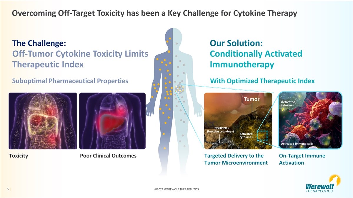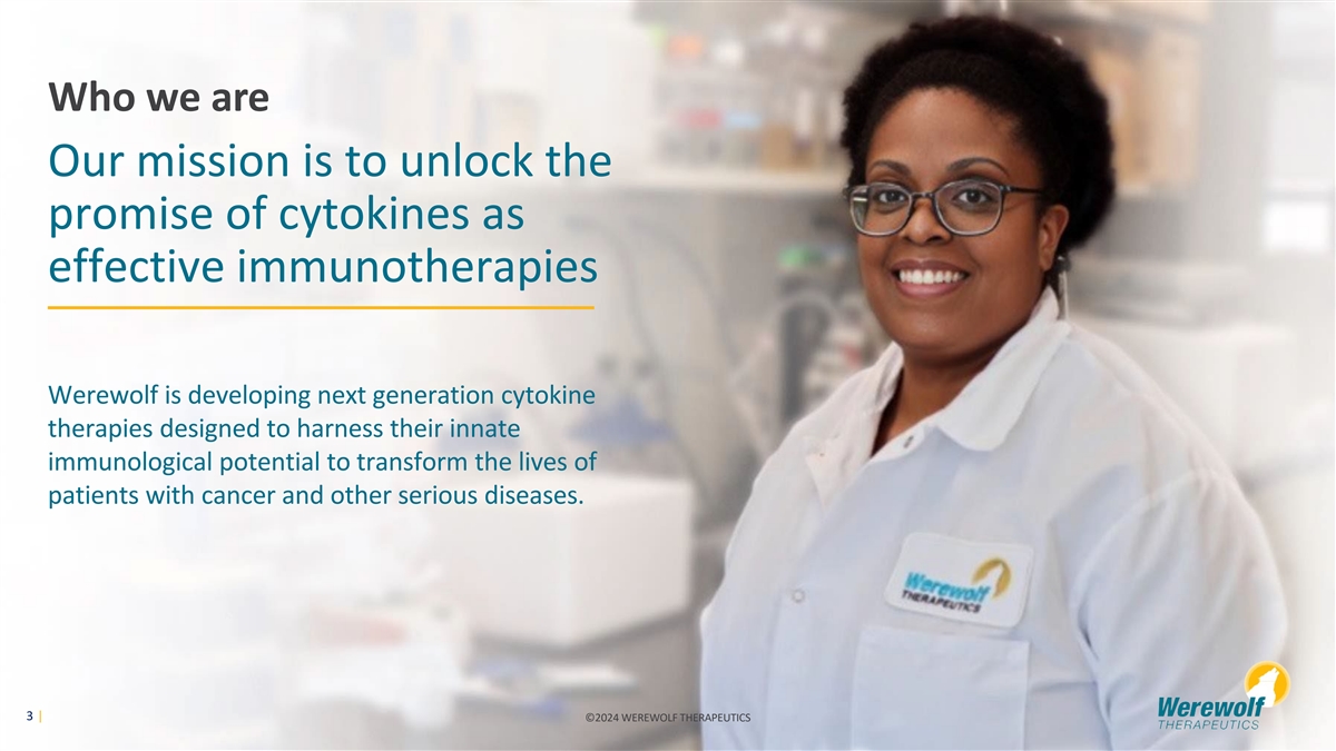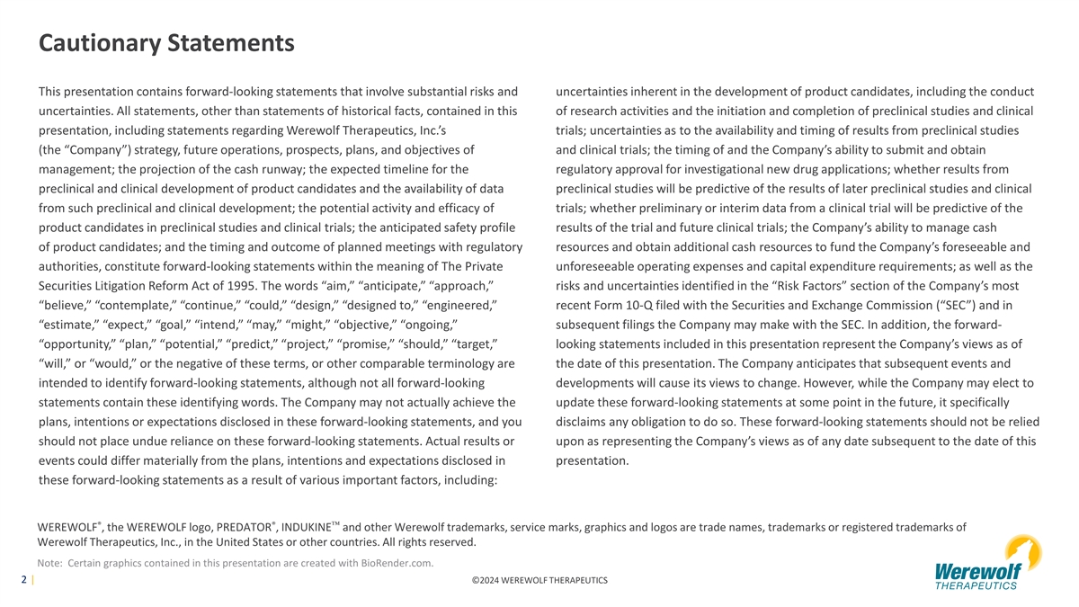 警示性声明本演示文稿包含前瞻性声明,这些声明涉及候选产品开发过程中固有的重大风险和不确定性,包括行为不确定性。本文件中包含的关于研究活动以及临床前研究和临床展示的启动和完成情况的所有陈述,除历史事实陈述外,包括关于Werewolf Therapeutics, Inc.试验的陈述;关于临床前研究结果的可用性和时间安排的不确定性(“公司”)战略、未来运营、前景、计划,和临床试验的目标;提交和获得管理的时间以及公司的能力;现金跑道的预测;研究性新药申请的监管批准的预期时间表;产品候选者的临床前和临床开发结果以及数据临床前研究的可用性是否将预测来自此类临床前和临床开发的后期临床前研究和临床结果;试验的潜在活性和有效性;临床试验的初步或中期数据是否将预测临床前研究中的产品候选者和临床试验;试验和未来临床试验的预期安全性结果;公司管理候选产品现金的能力;以及计划与监管资源举行会议并获得额外现金资源以资助公司可预见和授权的时间和结果,构成Private不可预见的运营费用和资本支出要求含义内的前瞻性陈述;以及1995年《证券诉讼改革法案》。公司最“相信”、“考虑”、“继续”、“可能”、“设计”、“设计”、“设计”、“工程”、最近向美国证券交易委员会(“SEC”)提交的10-Q表格以及“估计”、“预期”、“目标”、“打算”、“可能”、“可能”、“目标”、“进行中”等词语,以及公司可能向SEC提交的后续文件。此外,本演示文稿中包含的前瞻性“机会”、“计划”、“潜力”、“预测”、“项目”、“承诺”、“应该”、“目标”、前瞻性陈述代表公司对“将”或“将”或这些术语的否定或其他类似该公司预计,后续事件并打算识别前瞻性陈述,尽管并非所有前瞻性发展都会导致其观点发生变化。然而,尽管公司可能会选择声明中包含这些识别词。公司可能不会在未来某个时候实际实现这些前瞻性陈述的更新,它具体计划、意图或预期在这些前瞻性陈述中披露,而您不承担这样做的任何义务。不应依赖这些前瞻性陈述不应过分依赖这些前瞻性陈述。实际结果或作为代表公司在该事件发生日期之后的任何日期的观点,可能与演示中披露的计划、意图和预期存在重大差异。这些前瞻性陈述由于各种重要因素,包括:®®WEREWOLF、WEREWOLF徽标、PredATOR、INDUKINE等狼人商标、服务标记、图形和徽标是Werewolf Therapeutics, Inc.在美国或其他国家的商品名、商标或注册商标。版权所有。注意:本演示文稿中包含的某些图形是使用BioRender.com创建的。2 |©2024年狼人疗法