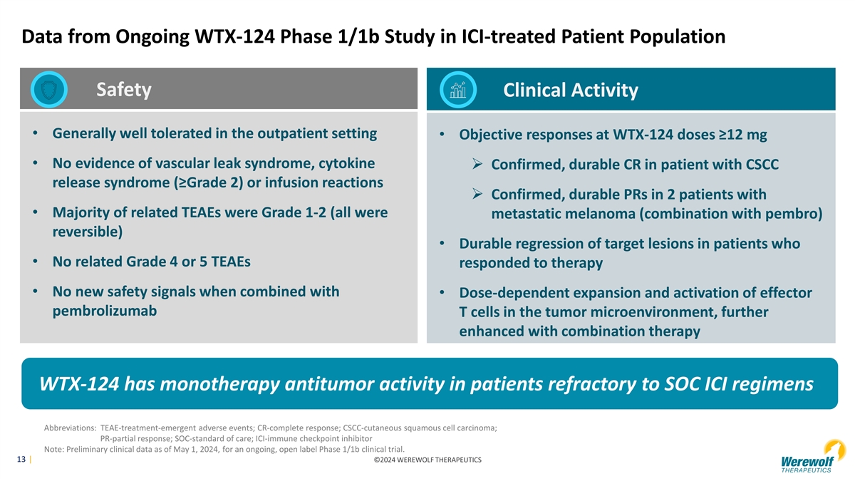 INDUKINE分子策略显著改善IL-2在WTX-124中掺入野生型IL-2的治疗窗口是完全肿瘤消退和免疫记忆形成所必需的WTX-124激活长期抗肿瘤免疫记忆改善的治疗窗口相比重组IL-2 WTX-124在MC38肿瘤模型中的抗肿瘤活性明显比“非α”IL-2 INDUKINE更有效缩写:TW-治疗窗口;CR-完全回归Nirschl CJ等,SITC 2023海报:最优抗肿瘤免疫由WTX-124触发,一种临床阶段条件激活的INDUKINE分子12 |©2024年狼人疗法