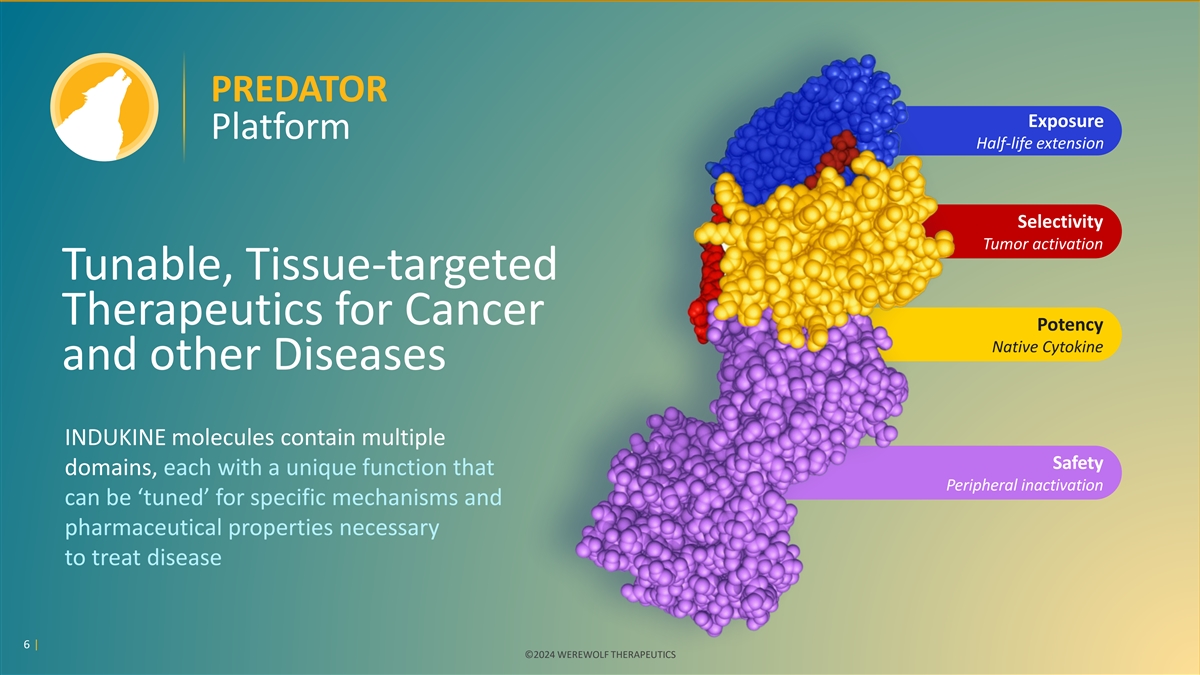 克服脱靶毒性一直是细胞因子治疗的关键挑战:我们的解决方案:肿瘤脱靶细胞因子毒性限制条件激活的治疗指标免疫治疗的次优药物特性与优化的治疗指标肿瘤激活的细胞因子INDUKINE(非活性细胞因子)激活的细胞因子激活的免疫细胞毒性差临床结果靶向递送到靶点免疫肿瘤微环境激活5 |©2024年狼人疗法