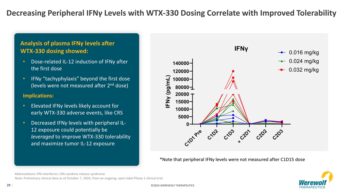 以WTX-330给药降低外周IFN γ水平与提高耐受性相关分析IFN γ WTX-330给药后血浆IFN γ水平显示:0.016mg/kg0.024mg/kg •剂量相关IL-12在140000后诱导IFN γ第一次给药0.032mg/kg120000 • IFN γ“快速抑制”超过第一次给药100000 nd(2次给药后未测量水平)8000020000影响:15000 • IFN γ水平升高可能导致了10000起早期WTX-330不良事件,像CRS 5000 •降低IFN γ水平与外周IL-0 12暴露可能被用于提高WTX-330耐受性*并最大限度地增加肿瘤IL-12暴露*注意,C1D15剂量后未测量外周IFN γ水平简称:IFN-干扰素;CRS-细胞因子释放综合征注:截至2024年10月7日的初步临床数据,来自一项正在进行的开放标签1期临床试验29 |©2024 WEREWOLF THERAPEUTICS C1D1 Pre C1D2 C1D3 C2D1 C2D2 C2D3 IFN γ(PG/ml)