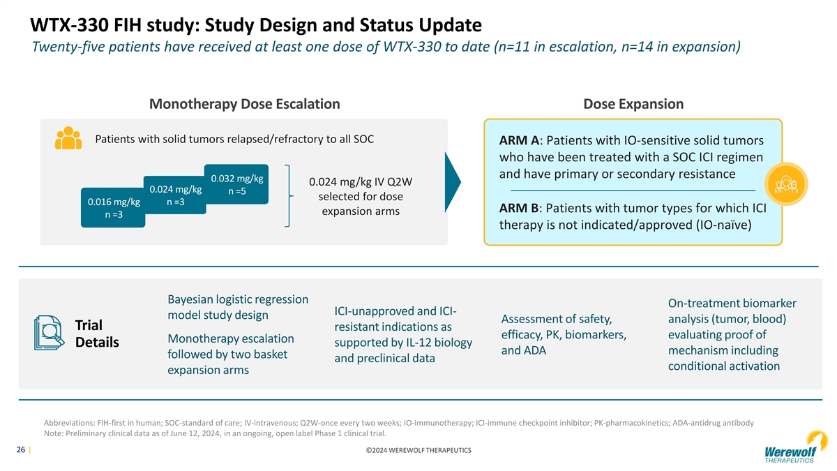 WTX-330 FIH研究:研究设计和状态更新迄今为止,已有25名患者接受了至少一剂WTX-330(n = 11在升级中,n = 14扩大)单药治疗剂量递增剂量扩大实体瘤患者复发/难治所有SOC ARM A:接受过SOC ICI方案治疗且有原发性或继发性耐药0.032mg/kg0.024mg/kg的IO敏感实体瘤患者IV Q2W0.024mg/kg n = 5选择剂量0.016mg/kg n = 3ARM B:未指示/批准ICI扩展臂n = 3治疗的肿瘤类型患者(IO-NA ï ve)贝叶斯逻辑回归治疗时生物标志物ICI-unapproved和ICI-model研究设计安全性评估,分析(肿瘤、血液)试验耐药适应症作为疗效、PK、生物标志物,由IL-12生物学细节和ADA机制支持的单药治疗升级评估证明,包括随后的两个篮子和临床前数据条件激活扩展臂简称:FIH-first in human;SOC-护理标准;IV-静脉注射;Q2W-每两周一次;IO-免疫治疗;ICI-免疫检查点抑制剂;PK药代动力学;ADA-抗药物抗体注:截至2024年6月12日的初步临床数据,在一项正在进行的开放标签1期临床试验中。26 |©2024年狼人疗法