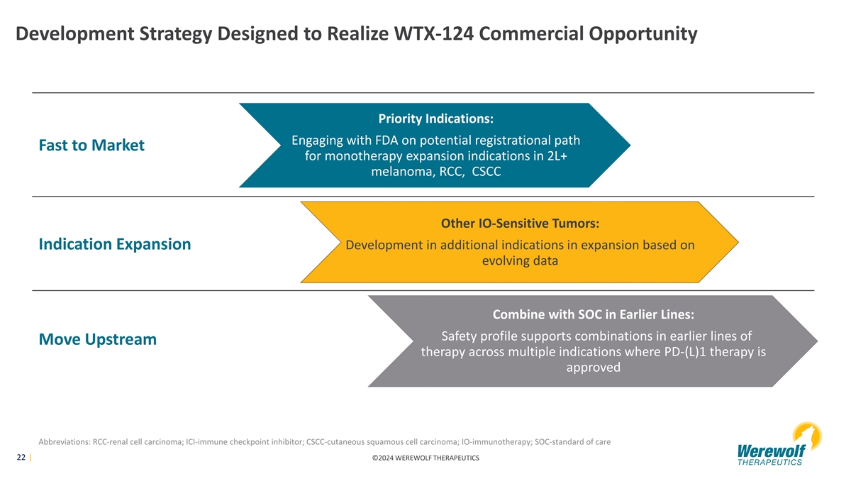 初步WTX-124 临床数据证明了一流IL-2疗法的潜力关键要点ü单药治疗活性和改善的耐受性在对所有SOC疗法(包括免疫检查点抑制剂ü与ICI和其他SOC的联合治疗,包括在早期治疗中,由可耐受的安全性支持ü原发性ICI耐药CSCC患者保持完全应答> 12个月ü持久,在2名接受联合WTX-124和派姆单抗ü WTX-124治疗的黑色素瘤患者中注意到的确诊部分缓解(> 7个月),根据临床活性和门诊安全性概况,选择18mg作为单一疗法和联合RDE,所有扩展臂现已开放供入组下一步ü预计在1H25的初步单一疗法扩展数据ü与监管机构讨论潜在的注册途径,包括加速批准单药疗法ü根据监管反馈在选定肿瘤类型中启动注册临床试验规划ü预计在1中发布初步单药疗法扩展da的下一个潜在里程碑:SOC-护理标准;ICI-免疫检查点抑制剂;CSCC-皮肤鳞癌;RDE-扩展推荐剂量21 |©2024年狼人疗法©2024 WEREWOLF THERAPEUTICS RDEE =扩围推荐剂量