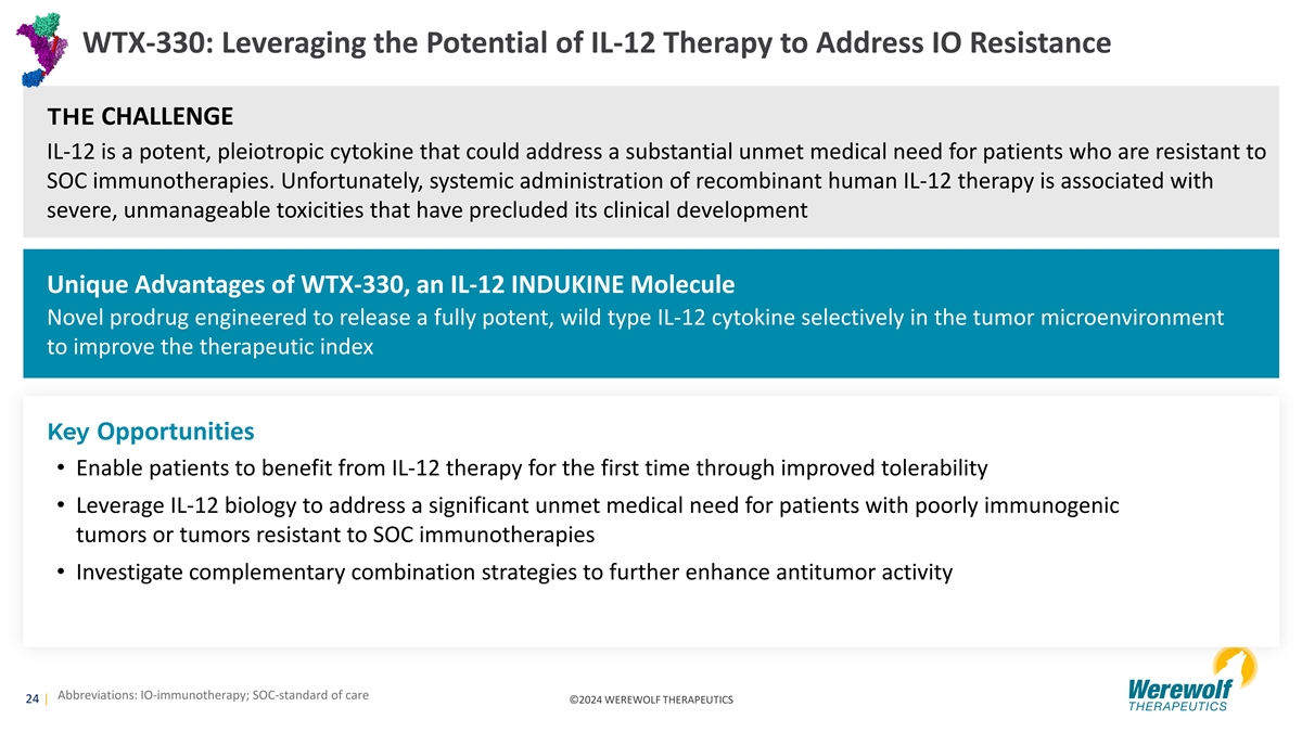 WTX-330:利用IL-12疗法的潜力解决IO耐药的挑战IL-12是一种有效的多效性细胞因子,可以解决对SOC免疫疗法有耐药性的患者大量未满足的医疗需求。不幸的是,重组人IL-12疗法的全身给药与严重的、无法控制的毒性有关,这些毒性已经阻止了其临床开发WTX-330的独特优势,WTX-330是一种IL-12 INDUKINE分子新型前药,被设计用于释放完全有效的,野生型IL-12细胞因子在肿瘤微环境中选择性提高治疗指数关键机会•通过提高耐受性使患者首次受益于IL-12治疗•利用IL-12生物学解决免疫原性差的肿瘤或SOC免疫疗法耐药的肿瘤患者的重大未满足的医疗需求•研究互补组合策略以进一步提高抗肿瘤活性简称:IO-免疫疗法;SOC-护理标准24 |©2024年狼人疗法