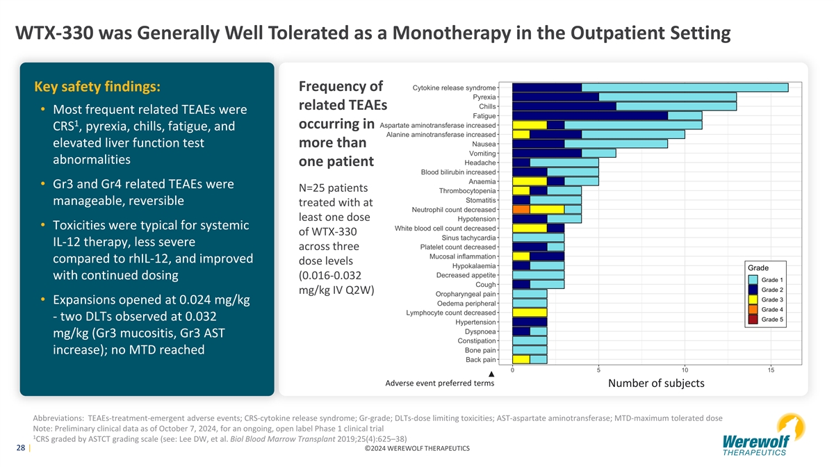 WTX-330在门诊环境中作为单一疗法普遍耐受性良好关键安全性发现:相关TEAEs的发生频率•最常见的相关TEAEs是1发生在CRS、发热、寒战、疲劳和肝功能测试升高超过异常1名患者• GR3和GR4相关TEAEs为N = 25名患者可控,至少一剂可逆治疗•毒性是WTX-330 IL-12治疗的典型全身毒性,与rhIL-12相比,在三种情况下不那么严重,并通过继续给药(0.016-0.032mg/kg IV Q2W)提高剂量水平•在0.024mg/kg时开启扩增-在0.032mg/kg时观察到两个DLT(GR3黏膜炎,GR3 AST升高);没有达到不良事件首选项的MTD受试者数量简称:TEAES-治疗-出现不良事件;CRS-细胞因子释放综合征;GR-级;DLTS-剂量限制性毒性;AST-天冬氨酸氨基转移酶;MTD最大耐受剂量注:截至2024年10月7日的初步临床数据,用于一项正在进行的开放标签1期临床试验1 CRS按ASTCT分级量表分级(参见:Lee DW,et al. Biol骨髓移植2019;25(4):625 – 38)28 |©2024年狼人疗法