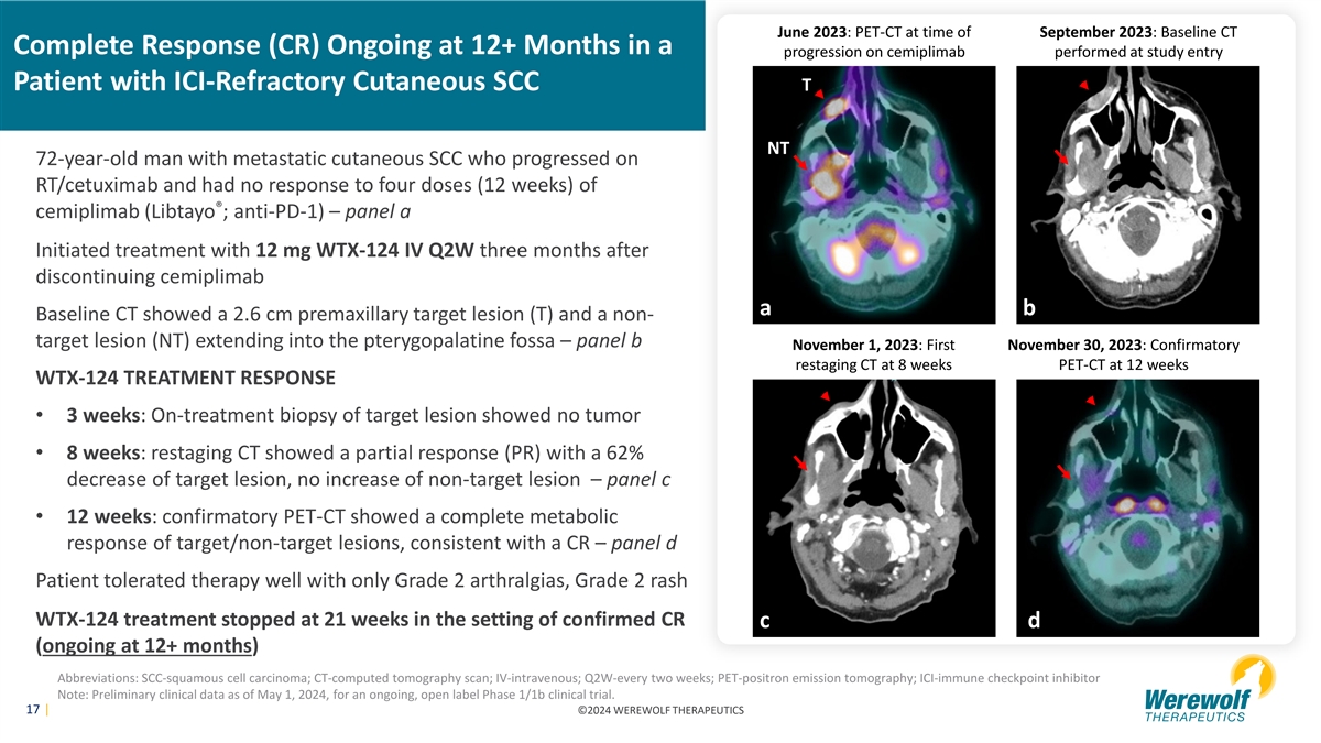 2023年6月:2023年9月时的PET-CT:基线CT完全缓解(CR)在12 +个月时正在进行的cemiplimab在研究进入时进行的ICI难治性皮肤SCC T NT 72岁男性转移性皮肤SCC患者在RT/cetuximab上进展且对四剂(12周)的治疗没有反应®cemiplimab(Libtayo;anti-PD-1)– panel a在停用cemiplimab 3个月后开始使用12 mg WTX-124 IV Q2W治疗a b基线CT显示2.6cm前颌骨目标病变(T)和延伸到翼腭窝的非靶点病变(NT)– panel b,2023年11月1日:2023年11月30日第一次:8周时的确认性再分期CT PET-CT在12周时的WTX-124治疗应答• 3周:治疗时的靶病灶活检显示无肿瘤• 8周:再分期CT显示部分缓解(PR),靶病灶减少62%,非靶病灶没有增加– panel c • 12周:确认性PET-CT显示靶/非靶病灶的完全代谢应答,与CR-panel d患者耐受治疗良好,仅有2级关节痛,2级皮疹WTX-124治疗在确诊CR CD的情况下于21周停止(12 +个月持续进行中)简称:SCC-鳞癌;CT计算机断层扫描;IV-静脉注射;Q2W-每两周一次;PET-正电子发射断层扫描;ICI-免疫检查点抑制剂注:截至2024年5月1日的初步临床数据,用于正在进行的、开放标签的1/1b期临床试验。17 |©2024年狼人疗法