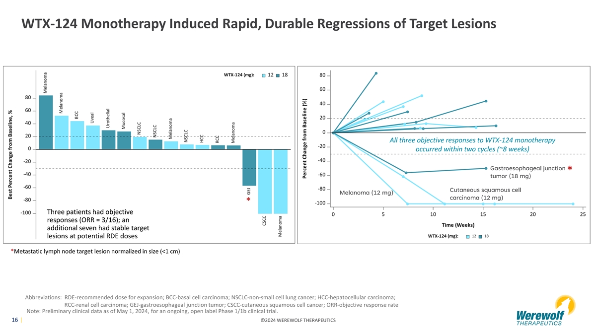 WTX-124单药治疗诱导快速,靶点病变的持久回归WTX-124单药治疗三种客观反应均发生在两个周期内(~8周)胃食管交界处*肿瘤(18mg)皮肤鳞状细胞黑色素瘤(12mg)癌(12mg)*3名患者有客观反应(ORR = 3/16);另有7名患者在潜在的RDE剂量下有稳定的目标病变*大小正常化的转移性淋巴结靶点病变(< 1 cm)简称:RDE-扩增推荐剂量;BCC-基底细胞癌;NSCLC-非小细胞肺癌;HCC-肝细胞癌;RCC-肾细胞癌;GEJ-胃食管交界处肿瘤;CSCC-皮肤鳞状细胞癌;OR-靶点缓解率注:截至2024年5月1日的初步临床数据,进行中的开放标签1/1b期临床试验。16 |©2024年狼人疗法