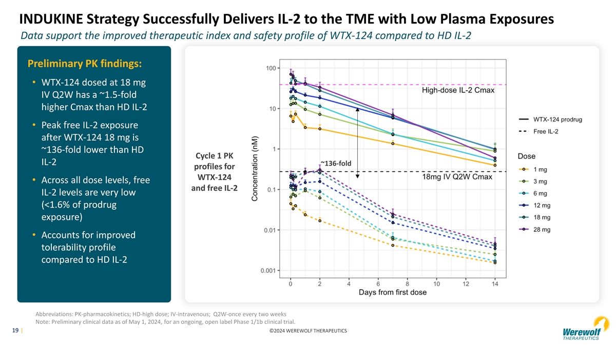INDUKINE策略成功向血浆低暴露的TME递送IL-2数据支持与HD IL-2相比,WTX-124的治疗指数和安全性得到改善初步PK发现:•在18mg IV Q2W下给药的WTX-124的Cmax比HD IL-2高约1.5倍• WTX-124 18 mg后的无峰IL-2暴露比HD周期1 PK IL-2低约136倍WTX-124的IL-2~136倍谱•在所有剂量水平上,游离和游离IL-2 IL-2水平非常低(< 1.6%的前体药物暴露)•与HD IL-2相比,耐受性得到改善缩写:PK药代动力学;HD-高剂量;IV-静脉注射;Q2W-每两周一次注:截至2024年5月1日的初步临床数据,用于正在进行的开放标签1/1b期临床试验。19 |©2024年狼人疗法