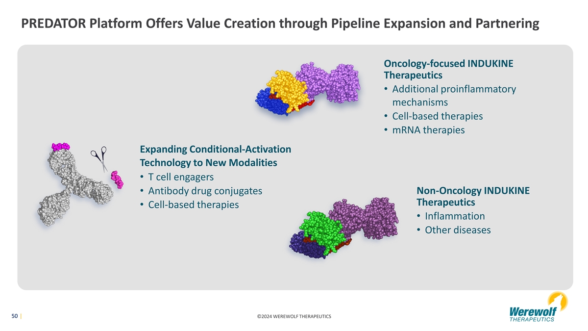 PredATOR平台通过管道扩展和与专注于肿瘤学的INDUKINE疗法合作提供价值创造•额外的促炎机制•基于细胞的疗法• mRNA疗法将条件激活技术扩展到新模式• T细胞接合器•抗体药物偶联非肿瘤INDUKINE疗法•基于细胞的疗法•炎症•其他疾病50 |©2024年狼人疗法