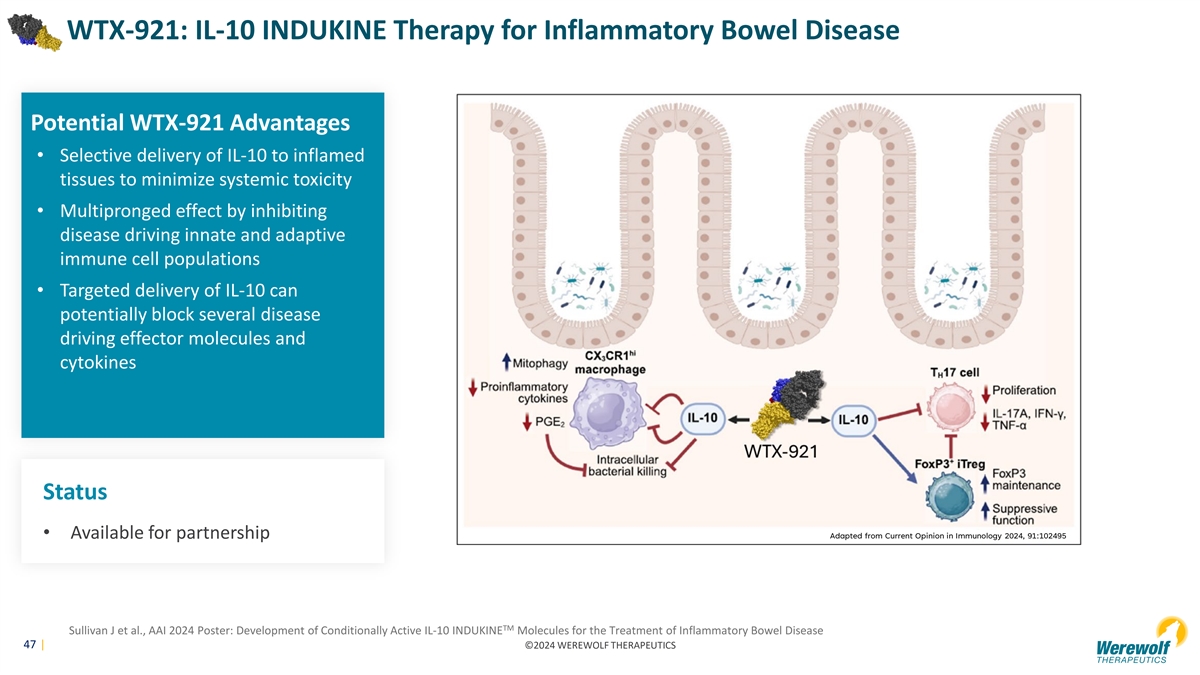 WTX-921:IL-10 INDUKINE治疗炎症性肠病的潜在优势WTX-921 •将IL-10选择性递送至发炎组织以最大限度地减少全身毒性•通过抑制疾病驱动先天和适应性免疫细胞群产生多管齐下的效果•靶向递送IL-10可潜在地阻断几种疾病驱动效应分子和细胞因子状态•可用于根据免疫学2024中的当前意见改编的合作伙伴关系,91:102495 TM Sullivan J等人,AAI 2024海报:开发用于治疗炎症性肠病的有条件活性IL-10 INDUKINE分子47 |©2024年狼人疗法