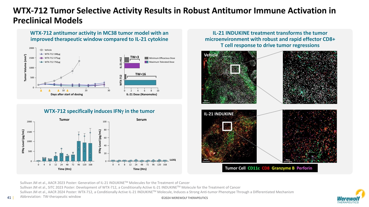 WTX-712肿瘤选择性活性在临床前模型中产生稳健的抗肿瘤免疫激活WTX-712在MC38肿瘤模型中的抗肿瘤活性与IL-21 INDUKINE治疗相比,转化了肿瘤改善的治疗窗口,具有稳健和快速的效应CD8 + T细胞反应驱动肿瘤消退载体WTX-712在肿瘤IL-21 INDUKINE肿瘤细胞CD11c CD8颗粒酶B穿孔素TM Sullivan JM等人中特异性诱导IFN γ,AACR2023海报:用于治疗癌症的IL-21 INDUKINE分子的生成TM Sullivan JM等人,SITC 2023海报:WTX-712的开发,一种有条件活性的IL-21 INDUKINE分子,用于治疗癌症TM Sullivan JM等,AACR2024海报:WTX-712,一种有条件活性的IL-21 INDUKINE分子,通过分化的机制简称:TW-治疗窗口41诱导强抗肿瘤表型|©2024年狼人疗法