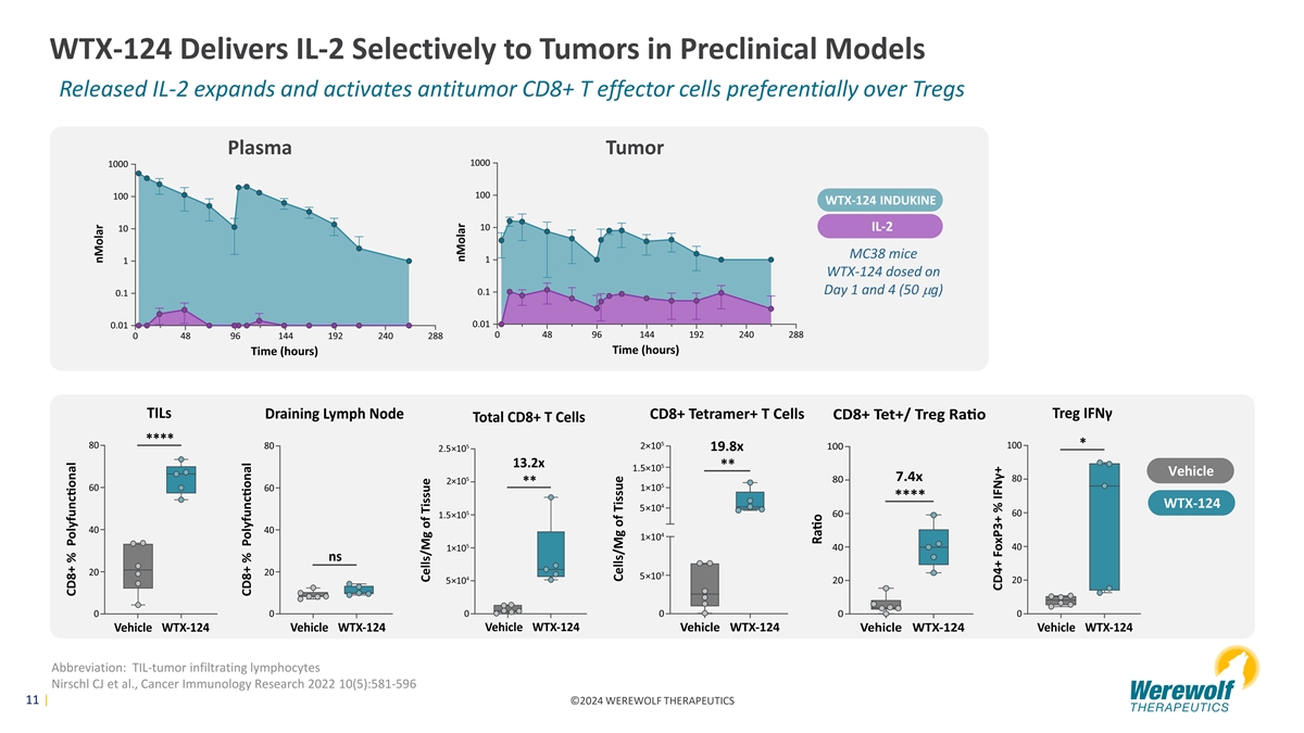 WTX-124在临床前模型中选择性地向肿瘤递送IL-2释放的IL-2扩增和激活抗肿瘤CD8 + T效应细胞优先于在第1天和第4天给药的Tregs血浆肿瘤WTX-124 INDUKINE IL-2 MC38小鼠WTX-124(50 μ g)载体WTX-124简称:TIL-肿瘤浸润淋巴细胞Nirschl CJ等,癌症免疫学研究202210(5):581-596 11 |©2024年狼人疗法