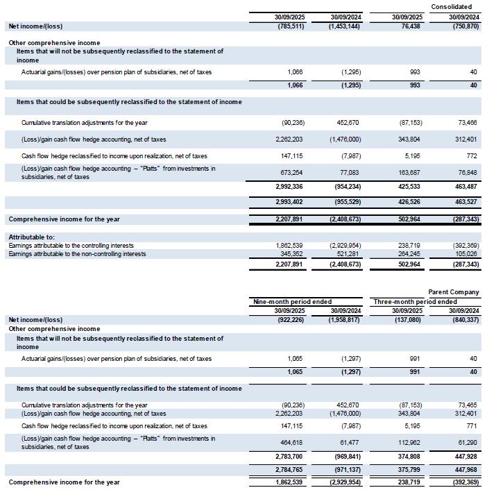 | (亏损)/收益现金流套期会计–对子公司投资的“普氏”,税后净额 | 673,254 | 77,083 | 163,687 | 76,848 | ||||