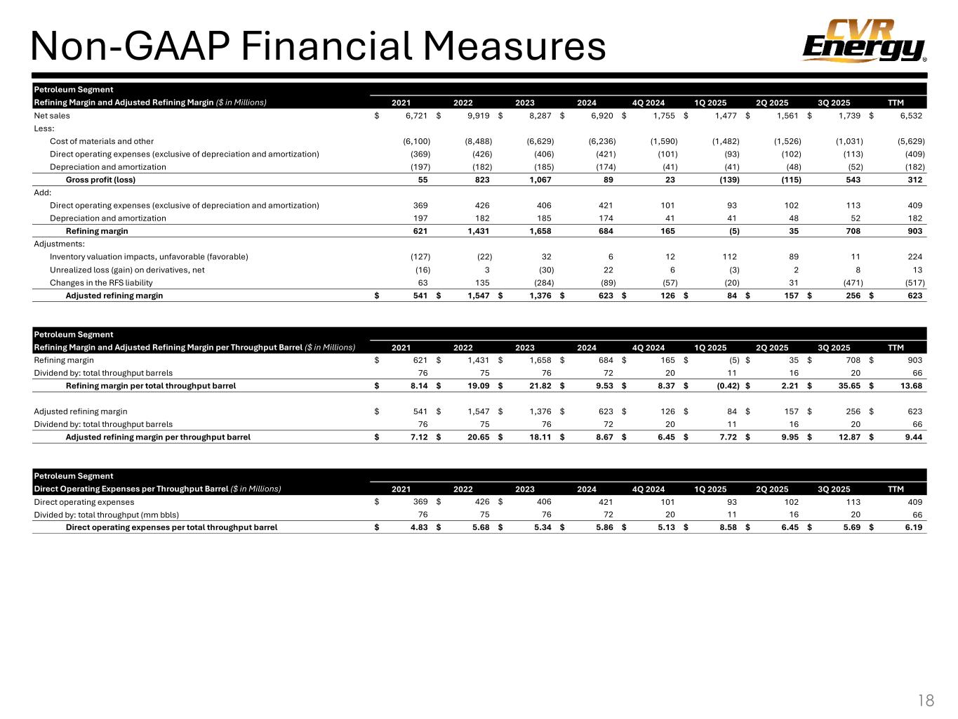 Non-GAAP财务指标17(百万美元)CVR能源,Inc. 2021202220232024 Q4 2024 Q1 2025 Q2 2025 Q3 2025 TTM净收入(亏损)74 $ 644 $ 878 $ 45 $ 40 $(105)$(90)$ 401 $ 246加:利息费用和其他融资成本,扣除利息收入11785527720253025100加:所得税费用(收益)(8)157207(26)(12)(49)(42)88(15)加:折旧和摊销279288298298746878111331 EBITDA 462 $ 1,174 $ 1,435 $ 394 $ 122 $(61)$(24)$ 625 $ 662 $ RFS负债变动63135(284)(89)(57)11289(471)(327)有价证券收益和出售权益法投资(81)--(24)--(24)衍生工具未实现亏损(收益),净额(16)5(32)226(3)2813库存估值影响,不利(有利)(127)(24)451420(24)321846看涨期权诉讼和解-79-------调整后EBITDA 301美元1369美元1164美元317美元67美元24美元99美元180美元370美元