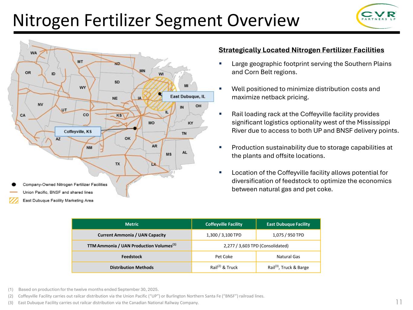 (1)基于截至2025年9月30日止十二个月的产量。(2)Coffeyville Facility通过联合太平洋(“UP”)或Burlington Northern Santa Fe(“BNSF”)铁路线进行轨道车配送。(3)东迪比克设施通过Canadian National Railway Company进行轨道车配送。氮肥板块概况11家战略布局的氮肥设施▪服务于南部平原和玉米带地区的巨大地理足迹。▪处于有利地位,可以最大限度地降低分销成本并最大限度地提高净回售定价。▪Coffeyville工厂的铁路装卸架提供了密西西比河以西的重要物流选择性,因为可以同时访问UP和BNSF交付点。▪由于工厂和异地地点的存储能力,生产可持续性。▪Coffeyville设施的位置允许原料多样化的潜力,以优化天然气和石油焦之间的经济性。Metric Coffeyville Facility East Dubuque Facility Current Ammonia/UAN capacity 1,300/3,100 TPD 1,075/950TPD TTM ammonia/UAN产量(1)2,277/3,603 TPD(consolidated)Feedstock PET焦炭天然气分配方式rail(2)& truck rail(3),truck & barge