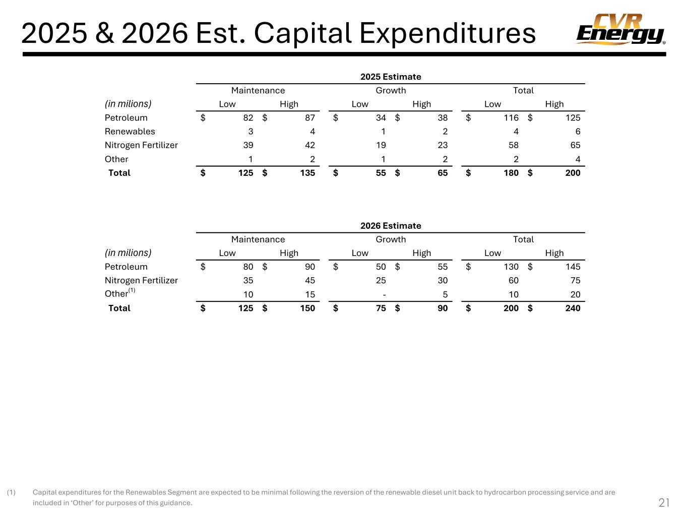 美国东部时间2025年和2026年。资本支出21(百万)低-高-低-高石油82 $ 87 $ 34 $ 38 $ 116 $ 125 $可再生能源341246氮肥394219235865其他121224总计125 $ 135 $ 55 $ 65 $ 180 $ 200 $ 2025估计维持增长总额(百万)低-高-低-高-高石油80 $ 90 $ 50 $ 55 $ 130 $ 145 $氮肥354525306075其他(1)1015-51020总计125 $ 150 $ 75 $ 90 $ 200 $ 240 $ 2026估计维持增长总额(1)资本支出对于可再生能源部分,在可再生柴油装置恢复为碳氢化合物加工服务后,预计将是最小的,并为本指南的目的被包括在“其他”中。