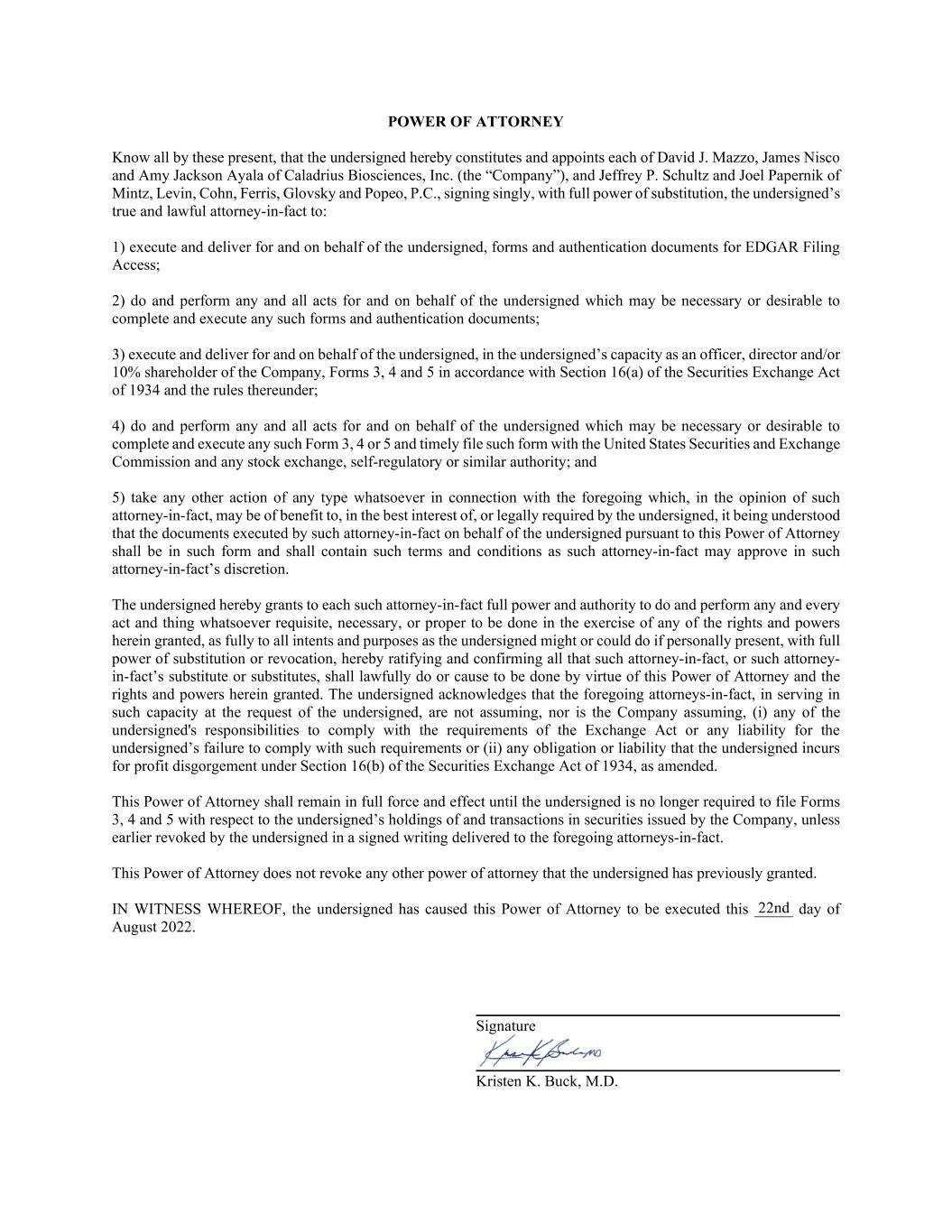授权委托书在场的各位都知道,以下签署人在此构成并任命Caladrius Biosciences, Inc.(“公司”)的David J. Mazzo、詹姆斯·尼斯科和艾米·杰克逊·阿亚拉,以及明茨、莱文、科恩、费里斯、格洛夫斯基和波佩奥的杰弗里·P·舒尔茨和乔尔·佩尔尼克,单独签署,并具有完全的替代权,签署人的真实合法代理人:1)代表签署人签署和交付,EDGAR归档访问的表格和认证文件;2)为和代表签署人做和执行任何和所有行为,这些行为对于完成和签署任何此类表格和认证文件可能是必要的或可取的;3)执行和交付代表签署人,以签署人作为公司高级职员、董事和/或10%股东的身份,根据1934年《证券交易法》第16(a)条和规则填写表格3、4和5在其下;4)做和执行任何和 为完成和签署任何此类表格3、4或5并及时向美国证券交易委员会和任何证券交易所提交此类表格可能需要或可取的代表签署人的所有行为,自律或类似权力;5)采取与上述相关的任何类型的任何其他行动,在该事实上的受权人看来,可能有利于、符合以下签名人的最佳利益或法律要求,不言而喻,该代理人根据本授权书代表下列签署人签署的文件应采用该形式,并应包含该代理人可能批准的条款和条件——事实上的自由裁量权。签名人在此授予每个此类事实上的受权人充分的权力和授权,以做和执行在行使任何权利时必须、必要或适当的任何行为和事情 和此处授予的权力,与签名人亲自出席时可能或可以做的完全符合所有意图和目的,并具有完全的替代或撤销权,特此批准和确认所有此类代理人,或此类代理人-事实的替代品或替代品,应根据本授权书和此处授予的权利和权力合法地做或促使做。签名人承认,上述实际受权人在应签名人的要求以此类身份服务时,不承担,公司也不承担,(i)签名人遵守交易法要求的任何责任或签名人未能遵守此类要求的任何责任或任何义务或责任根据经修订的1934年《证券交易法》第16(b)条,以下签名人因利润上缴而招致。本授权书应保持完全有效,直至 签署人不再需要就签署人持有的公司发行的证券和交易提交表格3、4和5,除非签署人提前以书面形式向上述实际受权人撤销。本授权书不会撤销签署人先前授予的任何其他授权书。兹兹证明,以下签名人已促使本授权书于2022年8月_____日生效。签名Kristen K. Buck,医学博士22nd