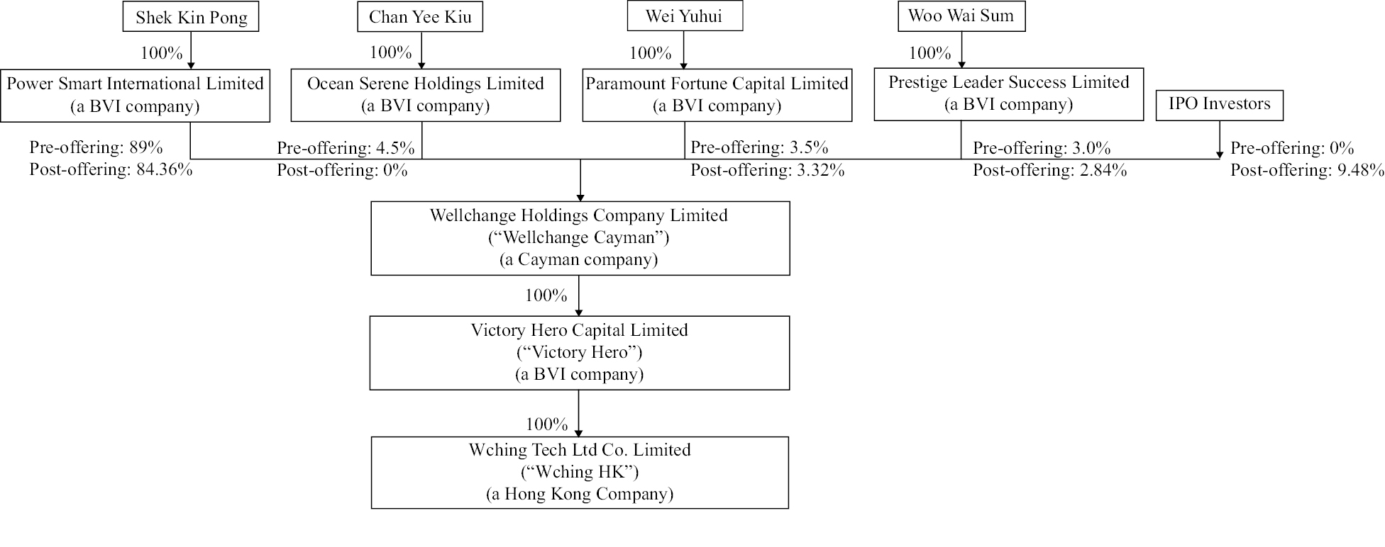 WellChange Holdings Company Limited,或称WellChange Cayman,是一家在开曼群岛注册成立的控股公司,没有自己的重大业务,我们通过WChing Tech Ltd Co. Limited,或WChing HK在香港开展我们的所有业务。招股说明书中提及的“公司”、“我们”、“我们的”和“我们的”是指将发行此次发行的普通股的开曼群岛实体WellChange Cayman及其子公司。提述“WChing HK”是指截至本招股章程日期,我们唯一的营运附属公司。这是一次发行开曼群岛控股公司WellChange Cayman的普通股,而不是WChing HK的股票。本次发行的投资者不得直接持有WCHING HK的任何股权。