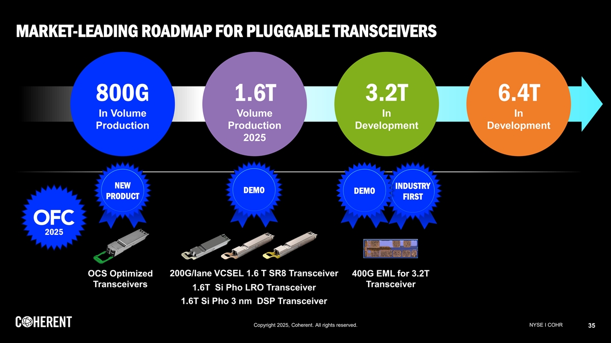 市场领先的可插拔收发器路线图800g 1.6t 3.2t 6.4t批量在产生产开发2025新行业DEMO DEMO产品FIRST 2025 OCS优化200g/lane VCSEL 1.6 t SR8收发器400g EML适用于3.2t收发器收发器1.6t Si Pho LRO收发器1.6t Si Pho 3 nm DSP收发器版权所有2025,连贯一致。版权所有。NYSE I COHR 35