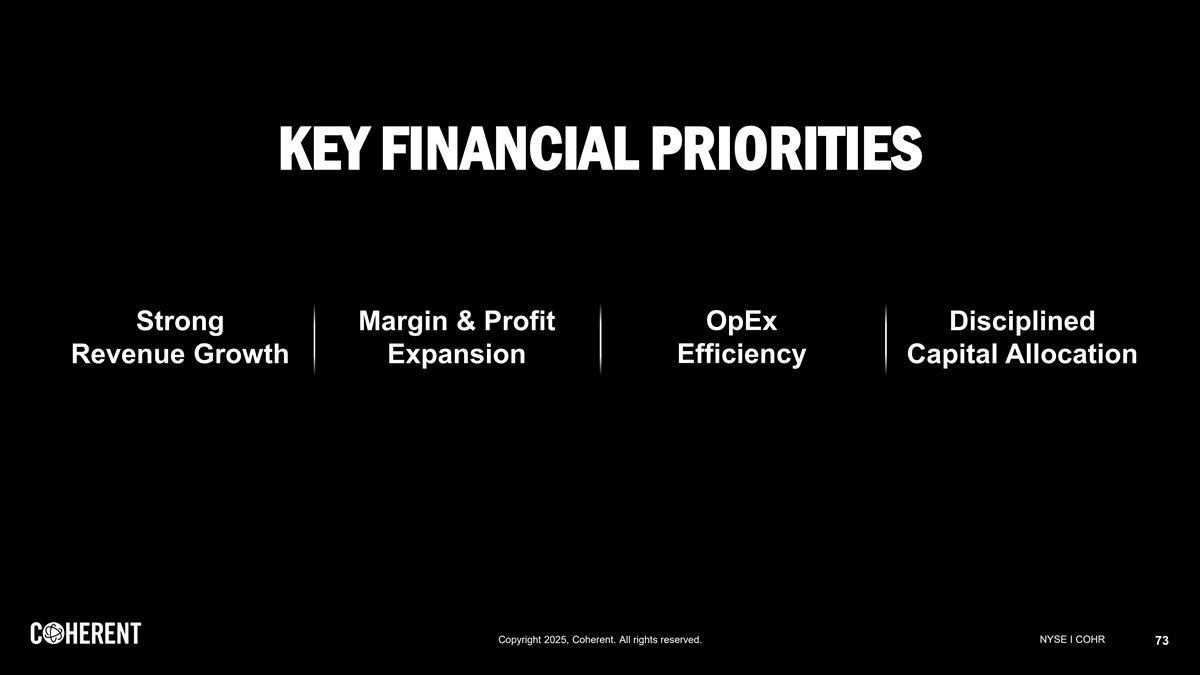 关键财务优先事项强劲的利润率和利润运营支出纪律收入增长扩张效率资本分配版权所有2025,连贯一致。版权所有。NYSE I COHR 73