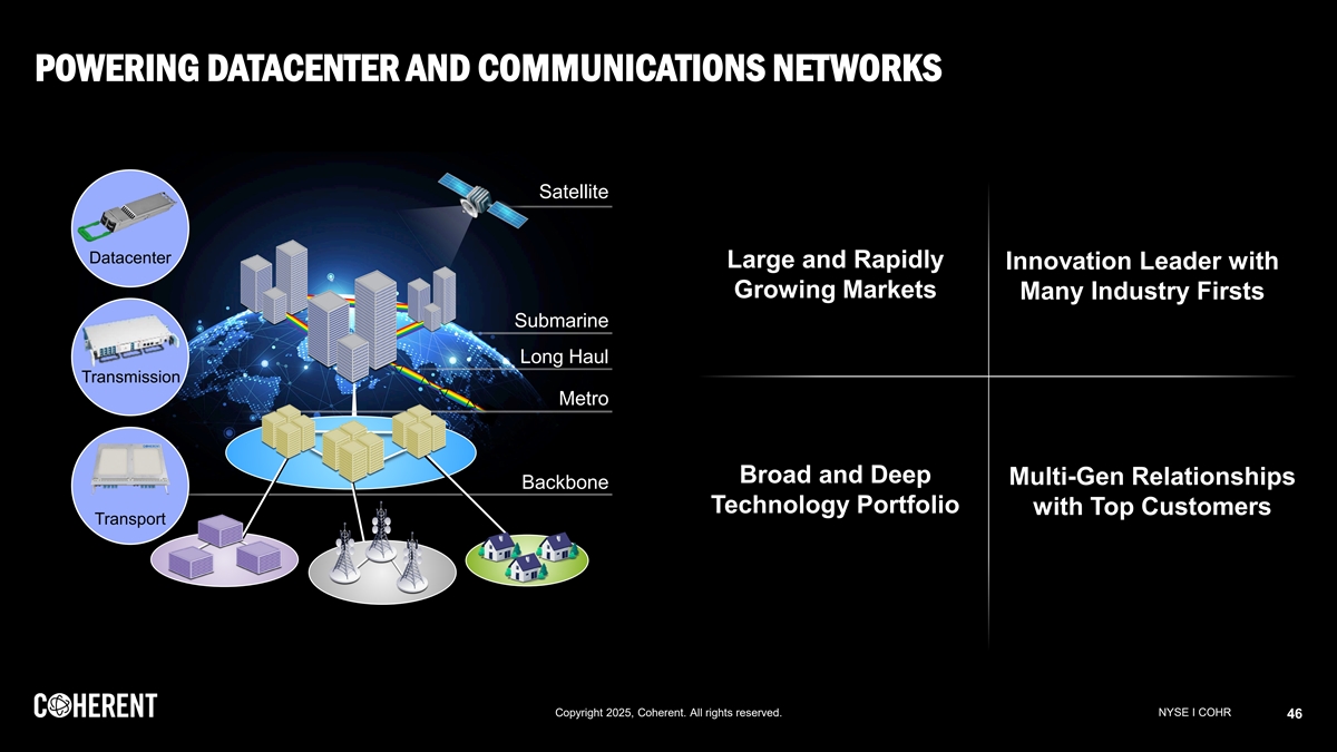 POWERING DATACENTER和Communications Network Satellite Datacenter大型快速创新领导者,市场不断增长多项业界首创潜艇长程传输Metro广泛而深入的多代关系骨干技术组合与顶级客户运输版权2025,连贯一致。版权所有。NYSE I COHR 46
