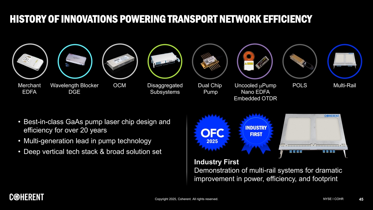 创新历史赋能运输网络效率商家波长阻隔器OCM分拆双芯片POLS多轨非制冷μ泵类EDFA DGE子系统泵类纳米EDFA嵌入式OTDR •一流GaAs泵浦激光芯片设计和行业效率超20年第一•泵类技术多代领先2025 •深度垂直技术堆栈和广泛的解决方案集合业界首次演示多轨系统,显着提高功率、效率和占地面积版权所有2025,连贯一致。版权所有。NYSE I COHR 45