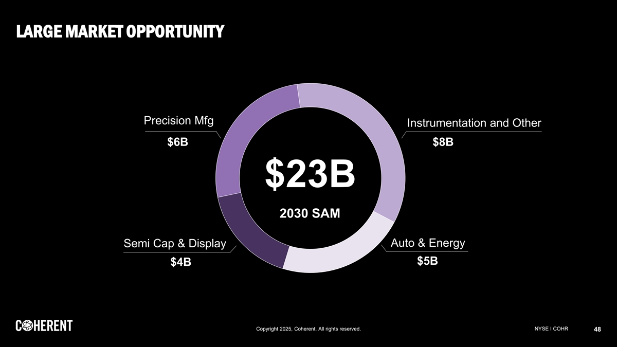 大市场机会Precision MFG Instrumentation and Other $ 6B $ 8B $ 23B 2030 SAM Auto & Energy Semi Cap & Display $ 5B $ 4B版权所有2025,连贯一致。版权所有。NYSE I COHR 48