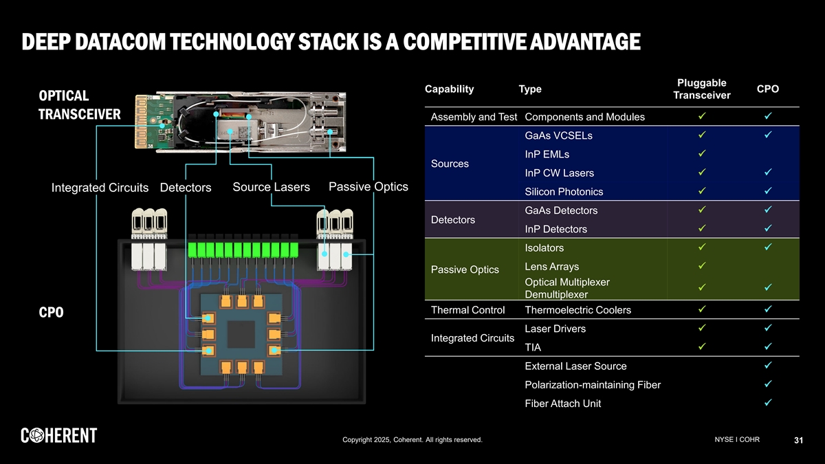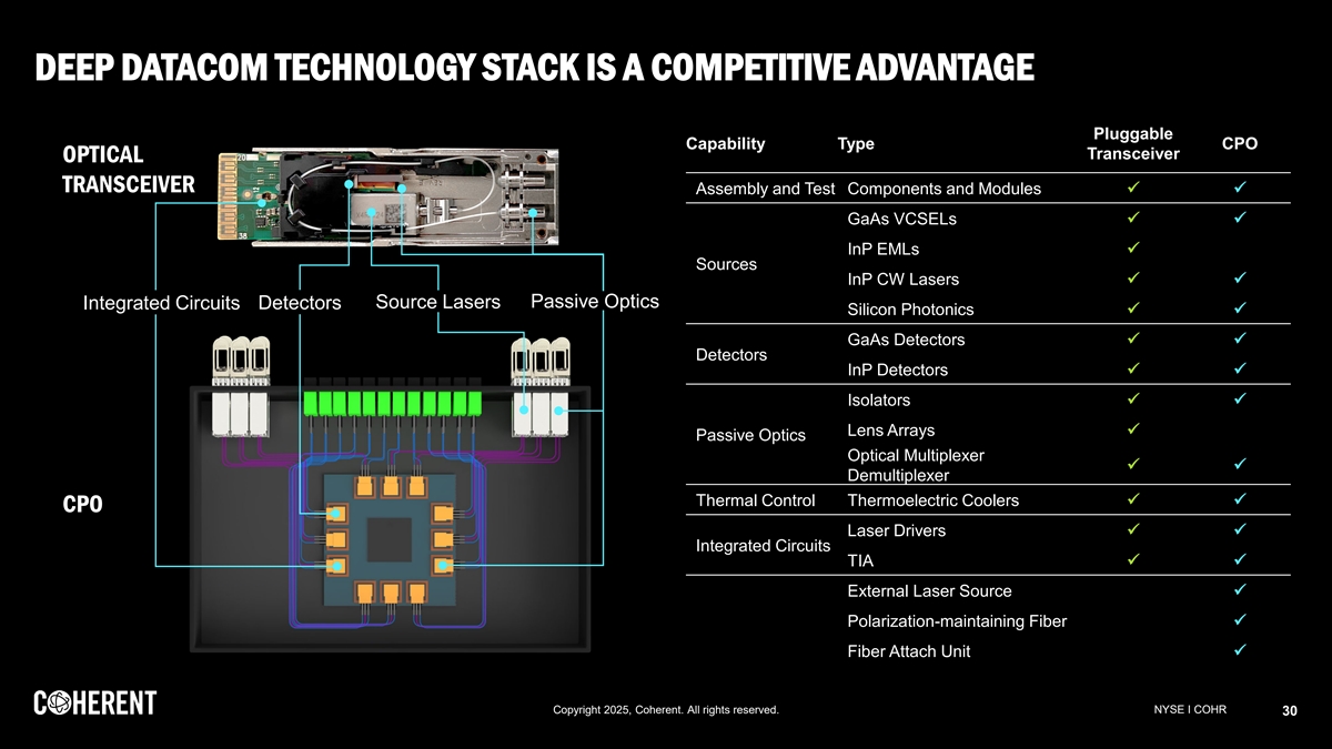 Deep DATACOM TECHNOLOGY STACK是一种具有竞争力的先进可插拔能力型CPO收发器光学传送器组装和测试组件和模块ü ü GaAs VCSEL ü ü InP EML ü Sources INP CW Lasers ü ü Source Lasers Passive Optics Integrated Circuits Detectors Silicon Photonics ü ü GaAs Detectors ü Detectors INP Detectors ü Isolators ü lens Array ü Passive Optics Optical Multiplexer ü ü demultiplexer热控制热电冷却器ü ü CPO Laser Drivers ü integrated Circuits TIA ü ü External Laser版权所有。NYSE I COHR 30